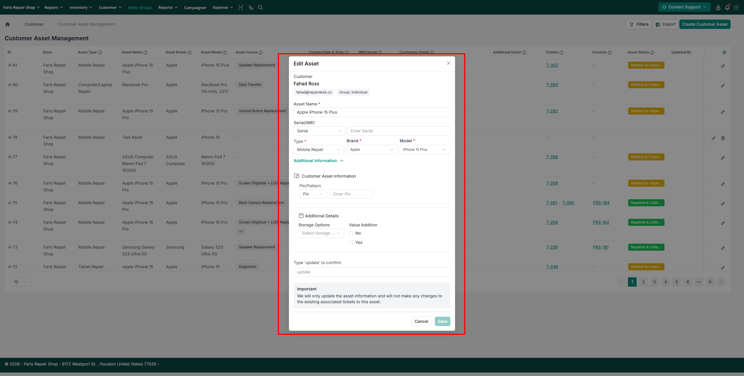You can now manually create a customer asset without linking it to a repair ticket. This is useful when you want to pre-register customer-owned items or maintain an inventory of assets that may come in for service later.