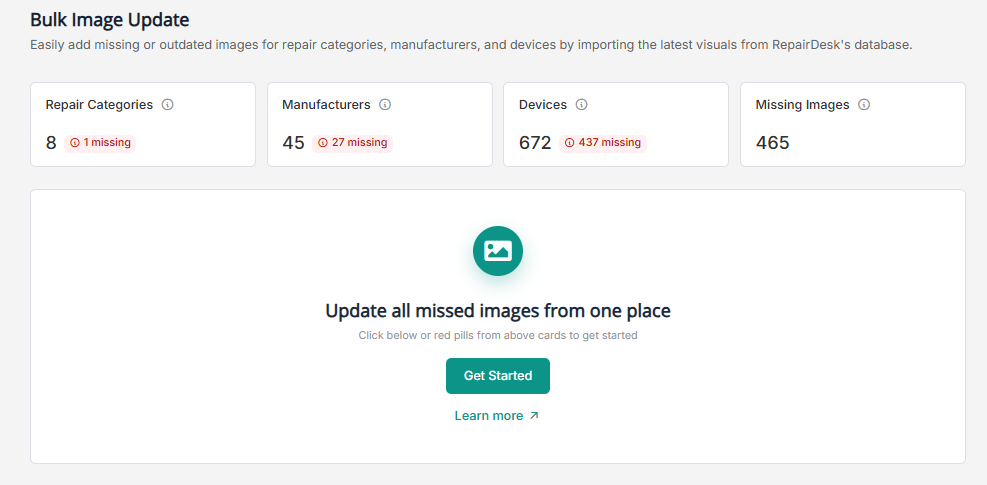 Keeping your RepairDesk visuals clean and professional just got easier. Our Bulk Image Update Tool lets you quickly add missing images across your catalog — including repair categories, manufacturers, and device models — all at once. Instead of navigating into each item individually, you can now upload the missing visuals in a single streamlined workflow.