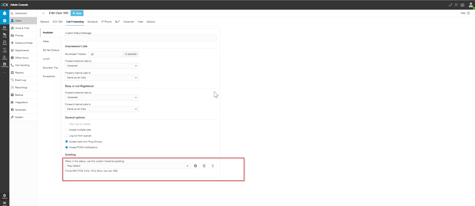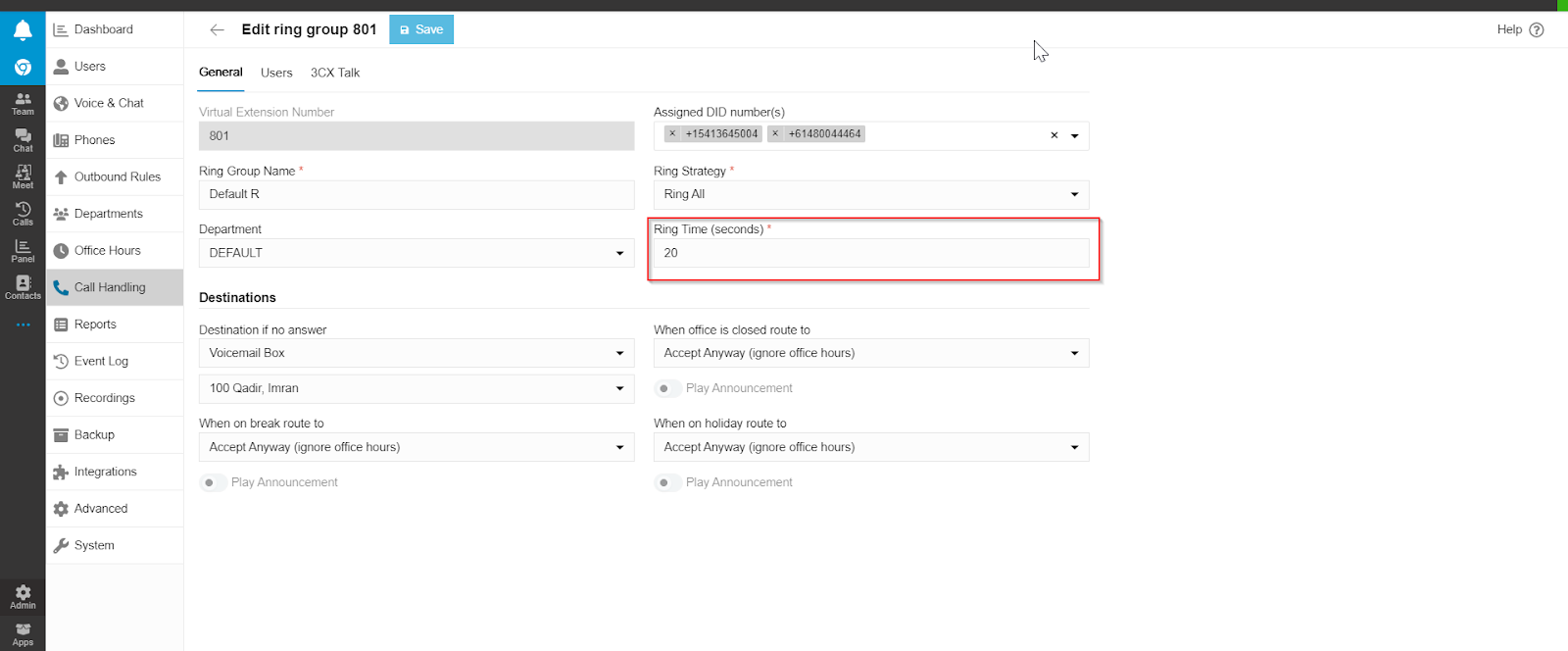 On your 3CX portal, the ring time can be changed & increased from Call Handling → Users. By default, the value for ring time is 20 seconds.