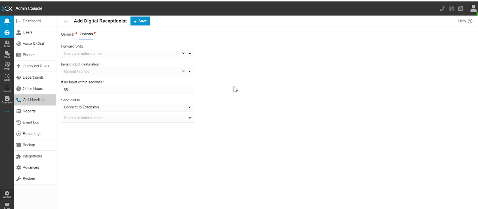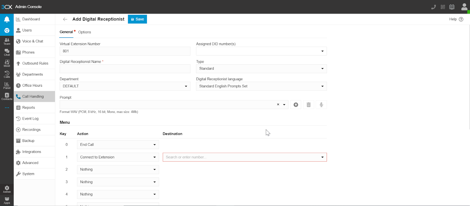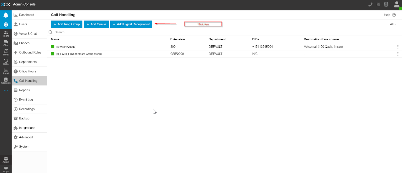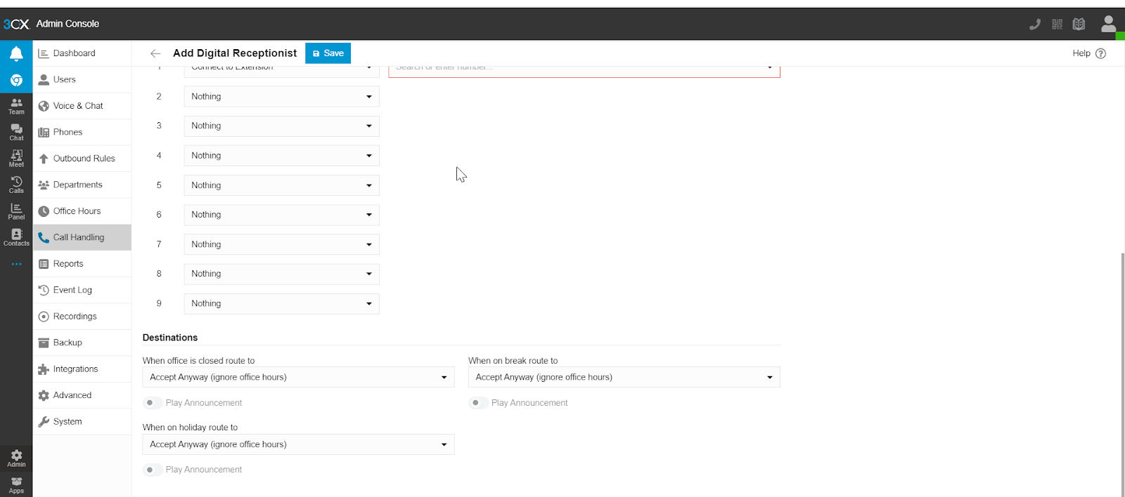 Once Extensions are set up on 3CX Portal the user can set up IVR (Interactive voice response) from Digital Receptionist option. Users can set that by clicking a certain number you can route to a specific extension.