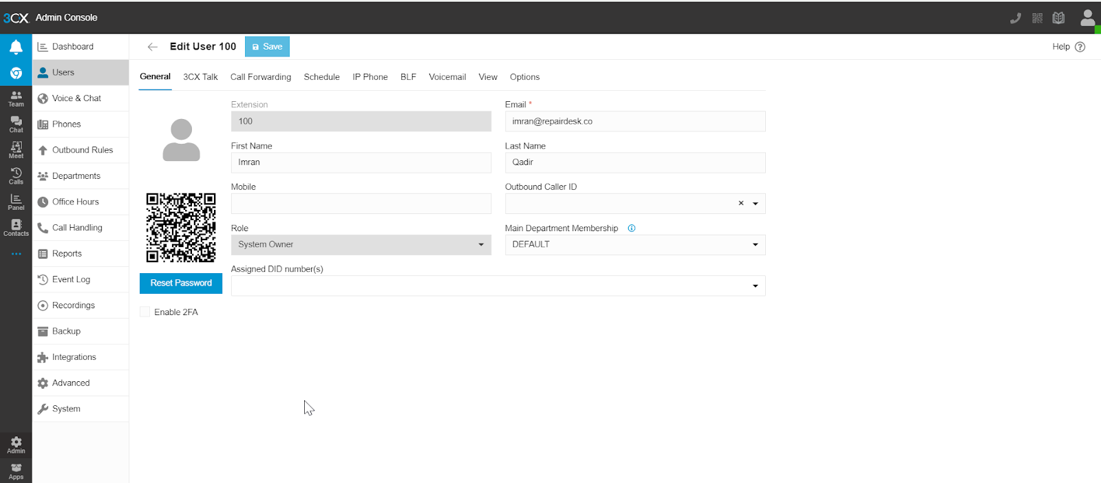 Once the extension is created there will be QR code option available which would allow you to login to your 3CX application by scanning that QR Code. This can be done from your dedicated 3CX Portal.