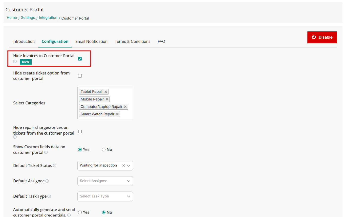 Yes! You can now choose to hide repair service prices, taxes, and totals when customers create, view, or list tickets on the Customer Portal. This gives you more control over how pricing information is displayed and allows you to discuss pricing directly with customers if needed.
