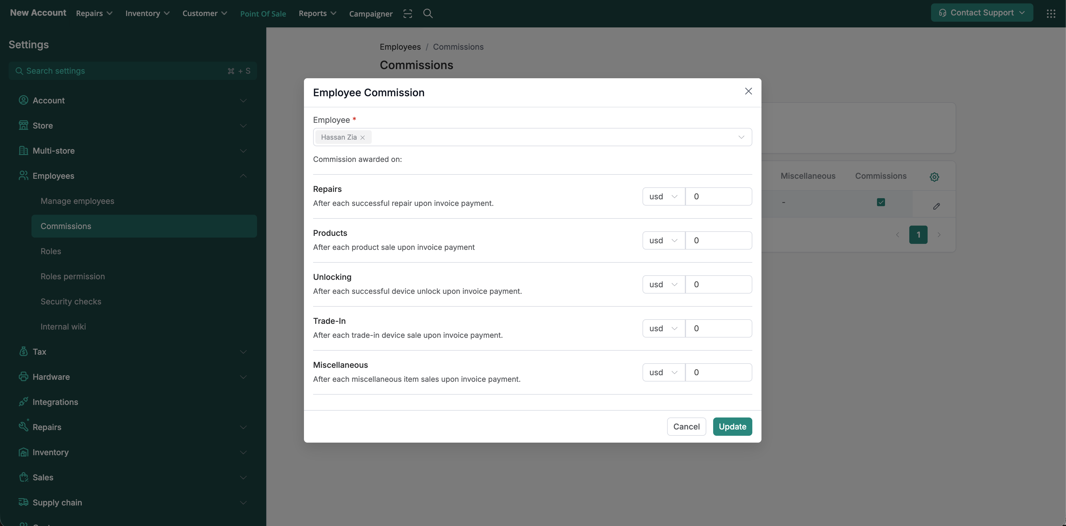 Navigate to Store Settings > Employees > Commissions > Tap edit for the selected employee > Set commission rates for different service categories (% or $) > Tap Update