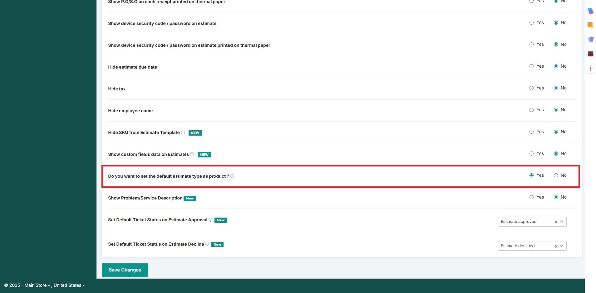 A. By default, the estimate type will be Service, but you can set it to product too. In order to set the default estimate type to product, go to Store Settings > Prospects > Estimates