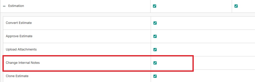Settings > Employees > Roles permission > Estimation > Change internal notes
