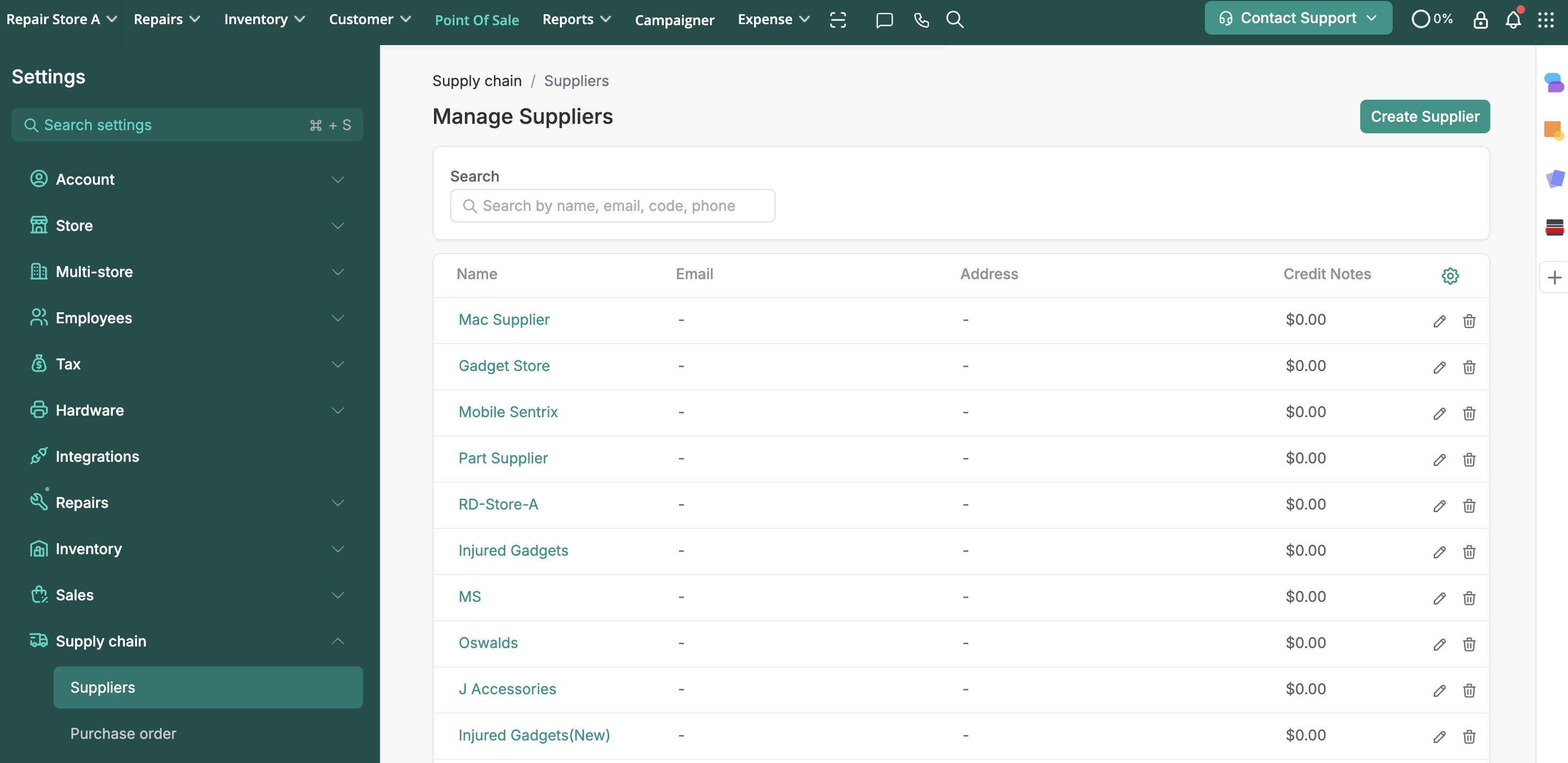 Repairdesk allows users to manage their suppliers easily. This article will guide you through the process of setting up suppliers in Repairdesk, including managing supplier details and adding new suppliers to the system.
