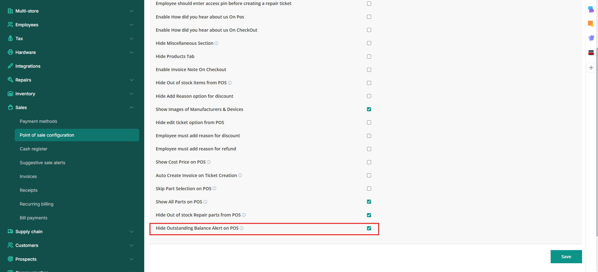 The "Hide Outstanding Balance Alert on POS" trigger is available under the configuration of POS.