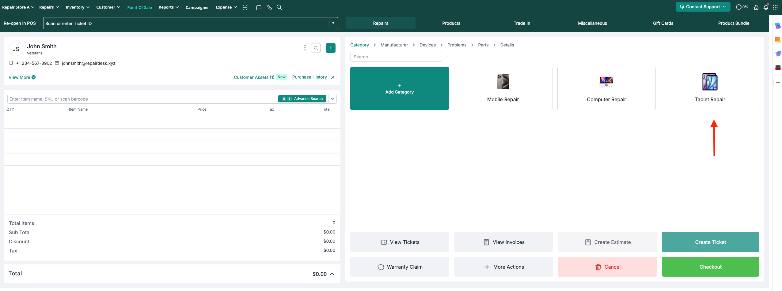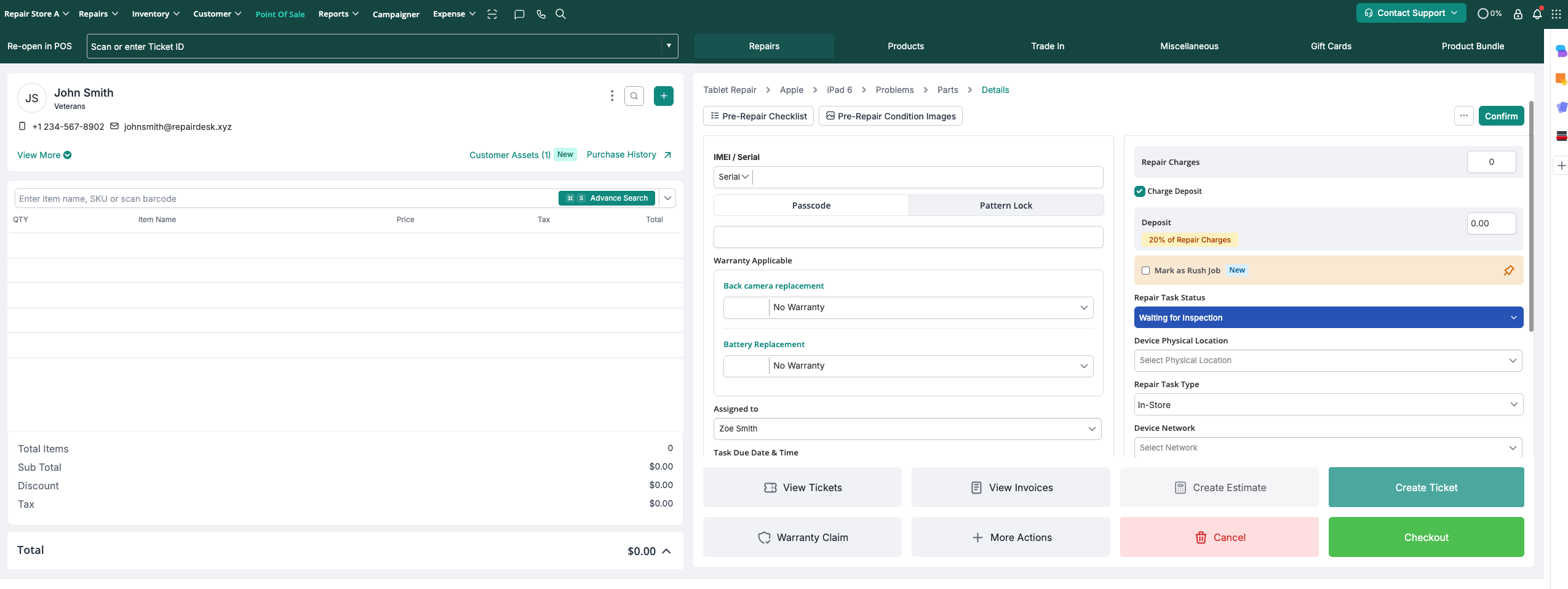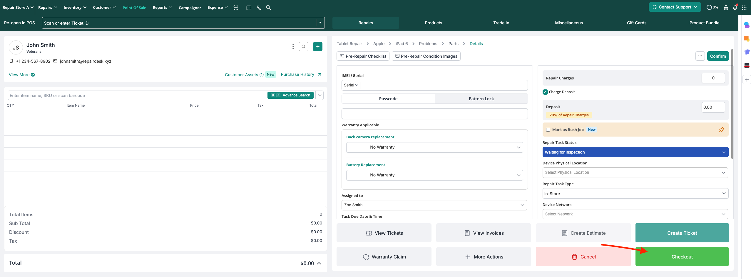 Click “Checkout” to complete the transaction. This will generate a repair ticket, send an SMS and email to the customer, and allow receipt printing.