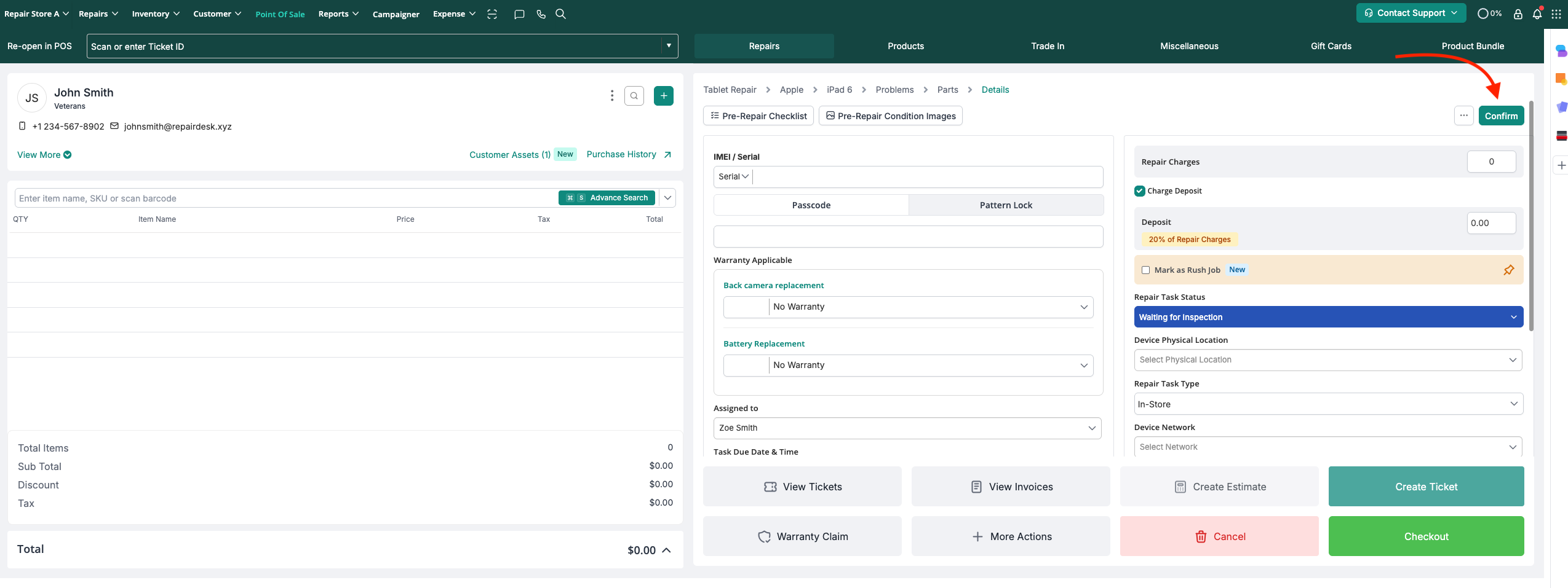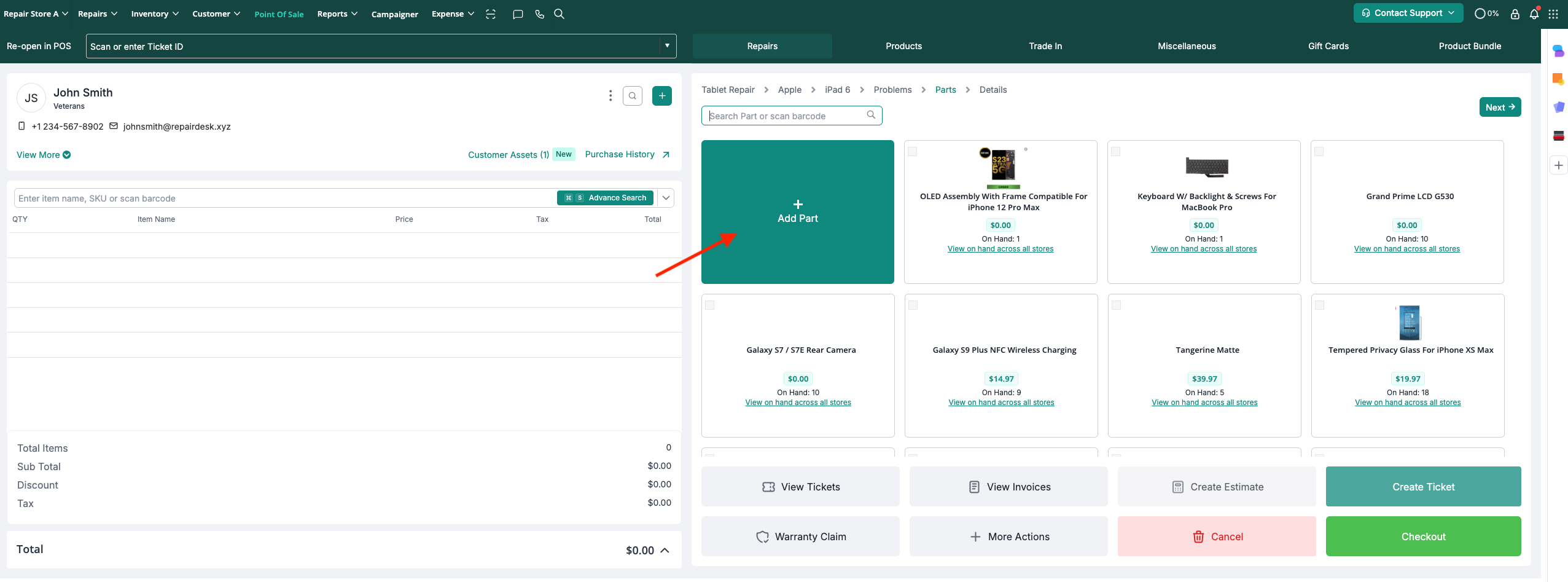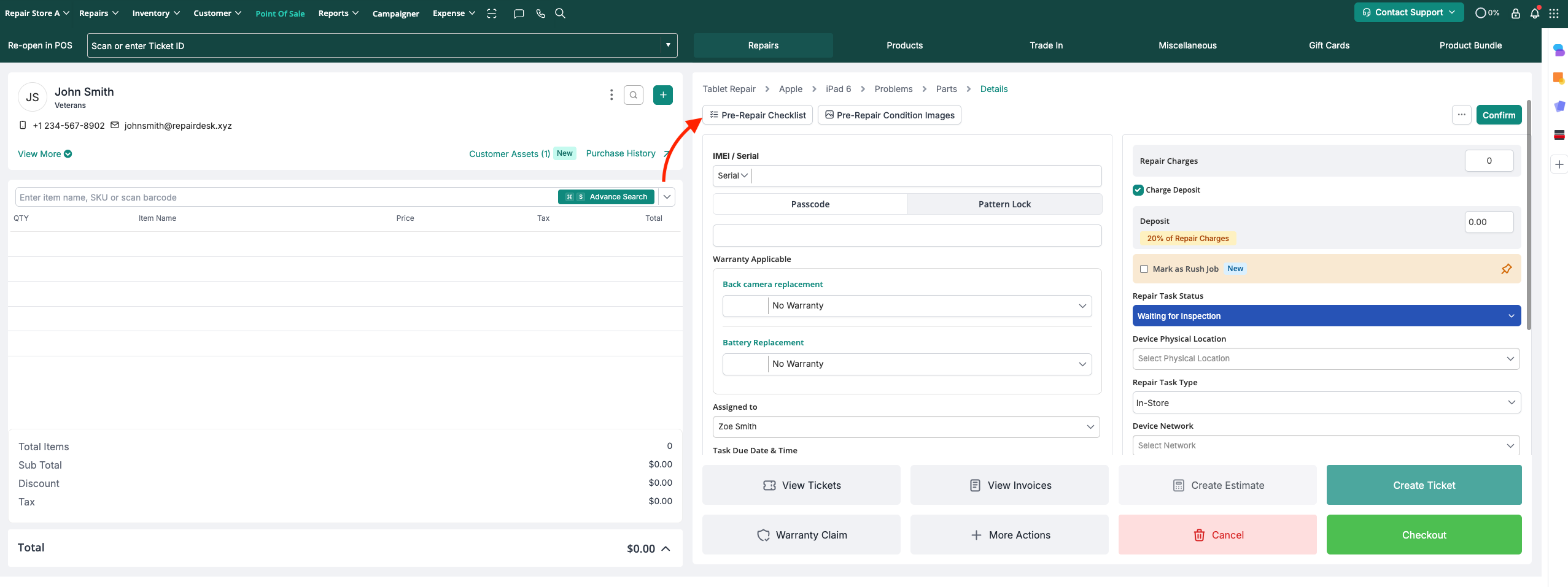Click “Checkout” to complete the transaction. This will generate a repair ticket, send an SMS and email to the customer, and allow receipt printing.
