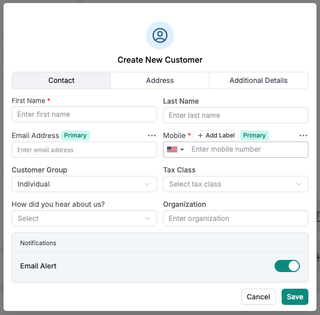 You can add customer details by clicking the plus sign in front of the customer name. A new popup will appear to add all relevant customer information.