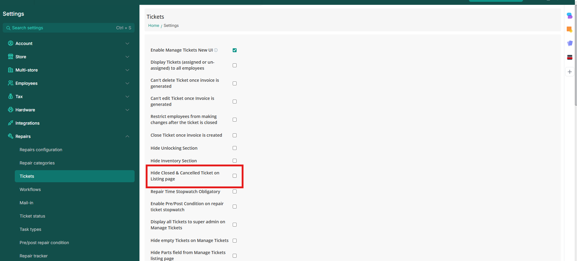 The module configuration in Store Settings > Repairs > Tickets screen includes a trigger that allows you to exclude tickets canceled, or similar status.