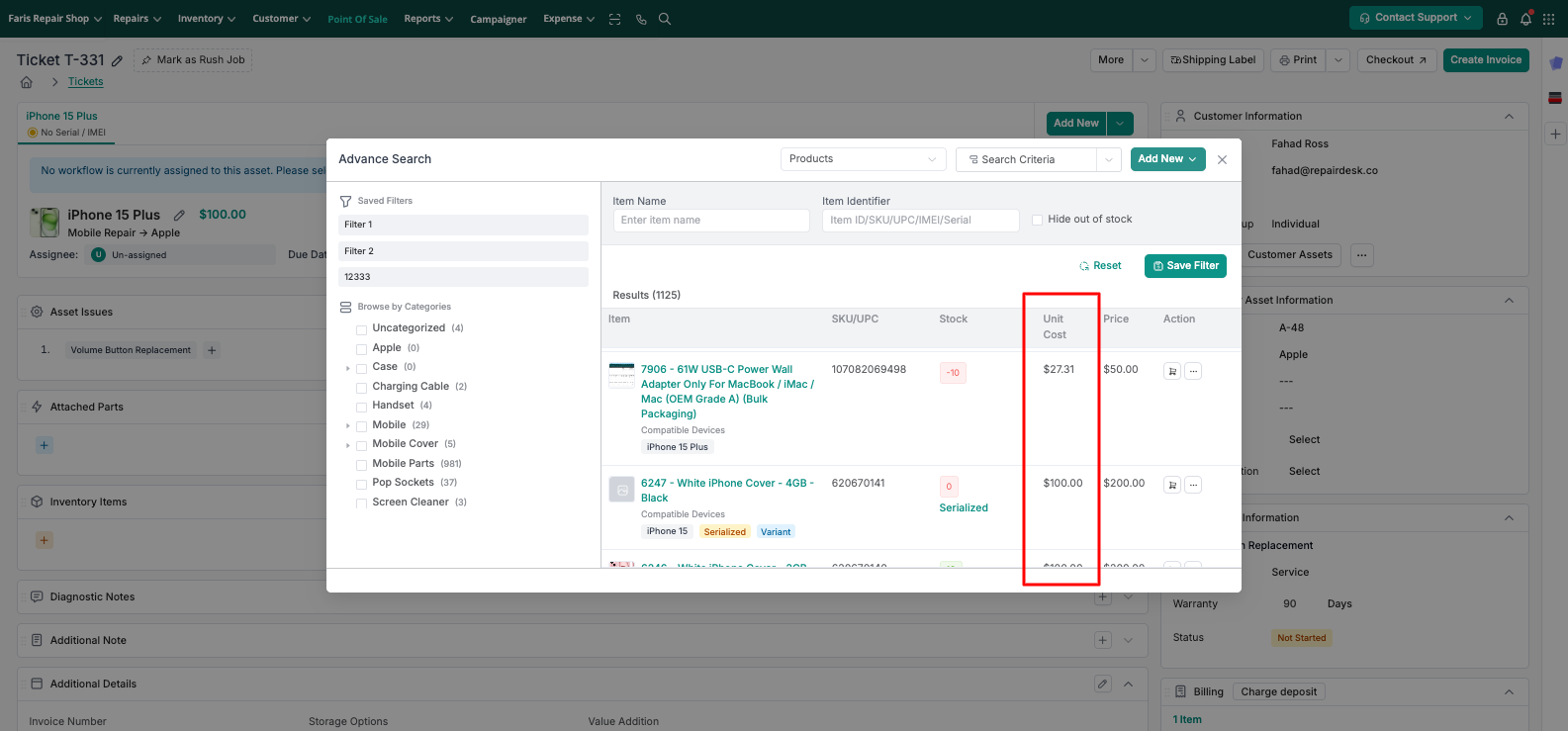 Yes, you can now view the cost price (Unit Cost) of inventory items directly on the ticket. This is available in both the item search (Advanced Search) and the Parts section of the ticket.