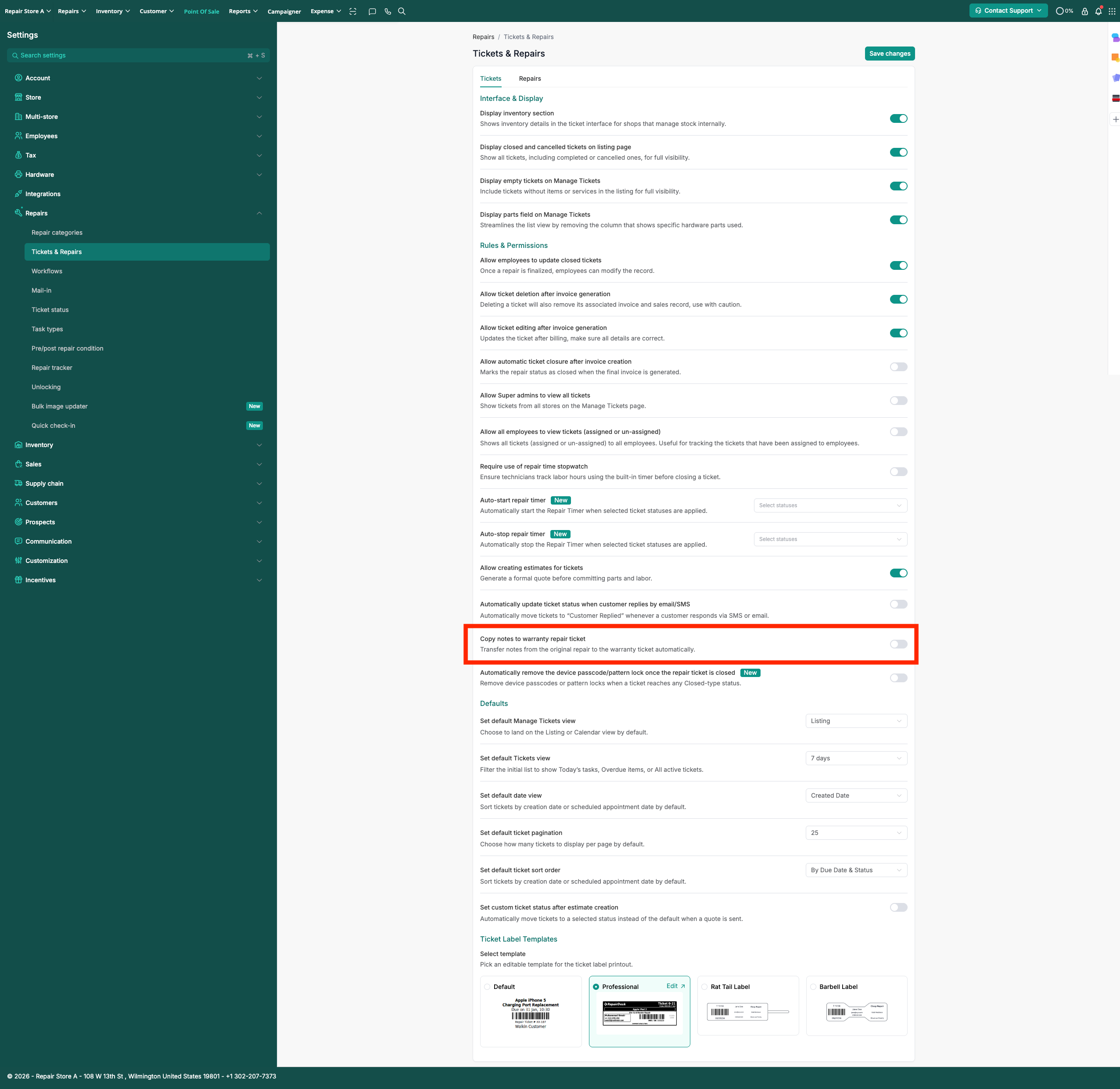 Go to 9 dots > Store Settings > Repairs > Tickets & Repairs