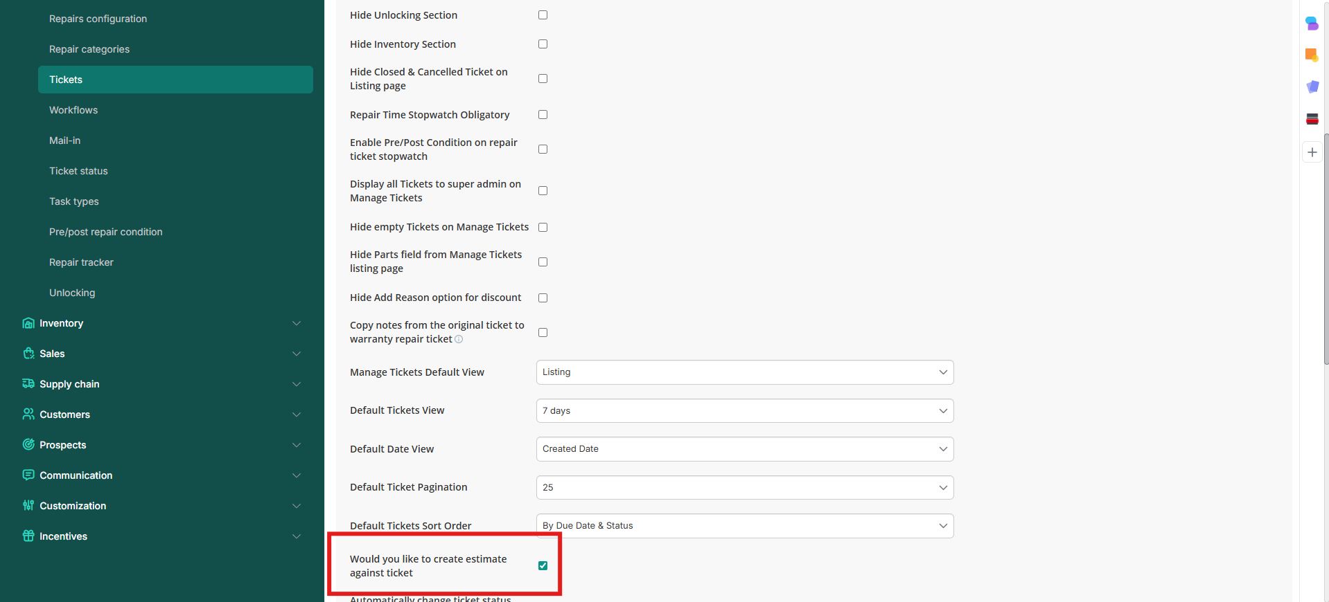 Store Settings > Repairs > Tickets > Would you like to create an estimate against the ticket