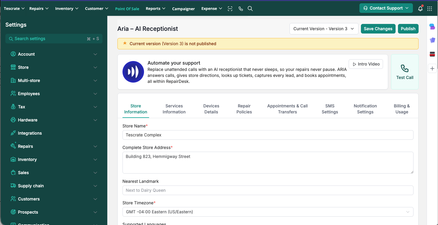 Go to Store Settings > Communication > Aria - AI Receptionist. This is where you configure everything, your store information, services, pricing, policies, and call handling rules.