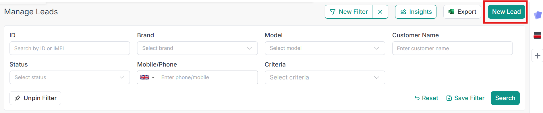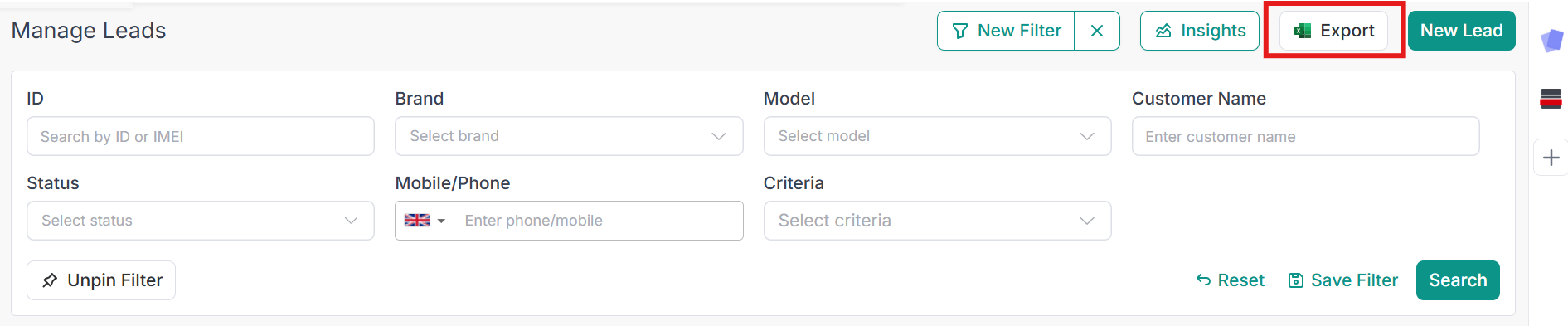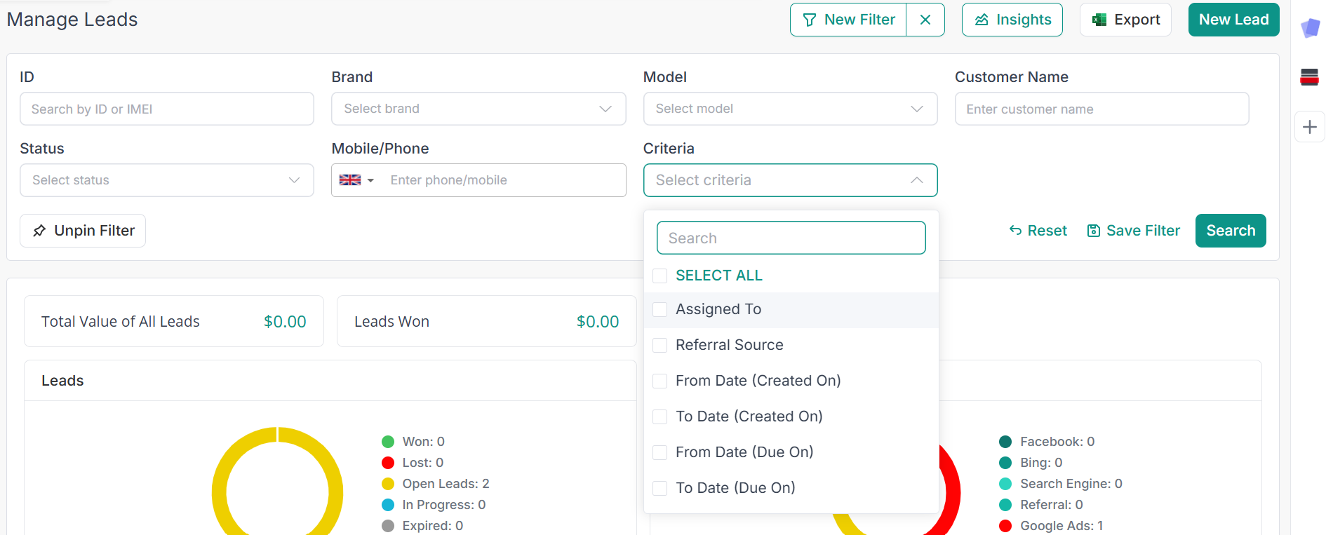 - Search by: This filter allows you to search for leads by their device IMEI, name, phone number, or ID.