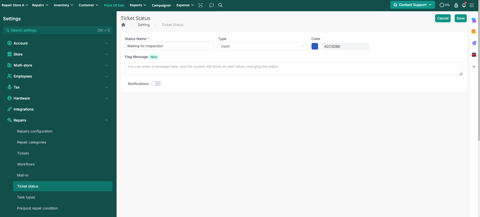 - Go to the 9 dots > Store Settings > Repairs> Ticket Status