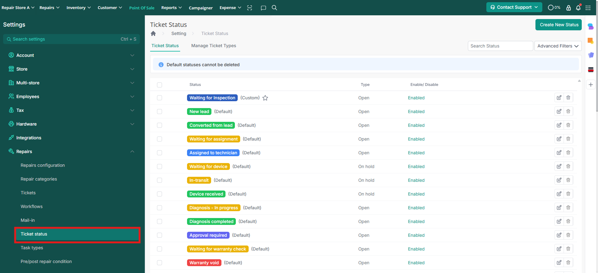 By default, RepairDesk comes with a set of ticket statuses. However, there might be instances where you want to change these statuses or add new ones according to your business needs. Follow the steps below to enable or disable ticket statuses: