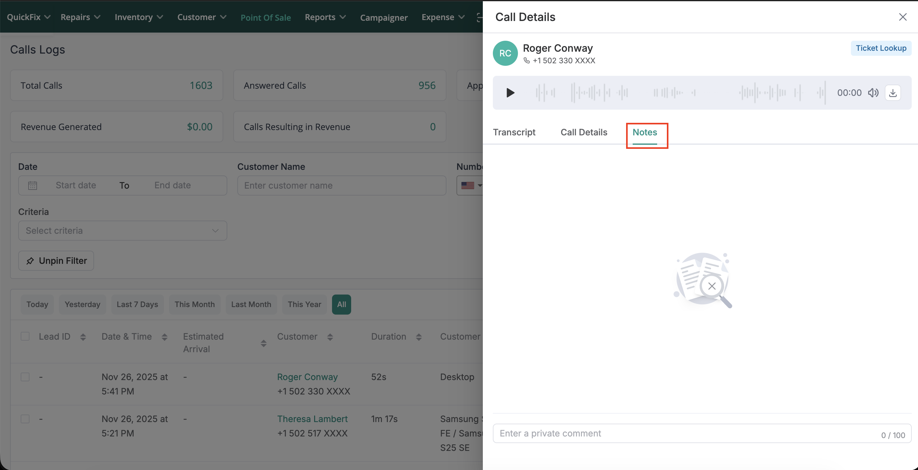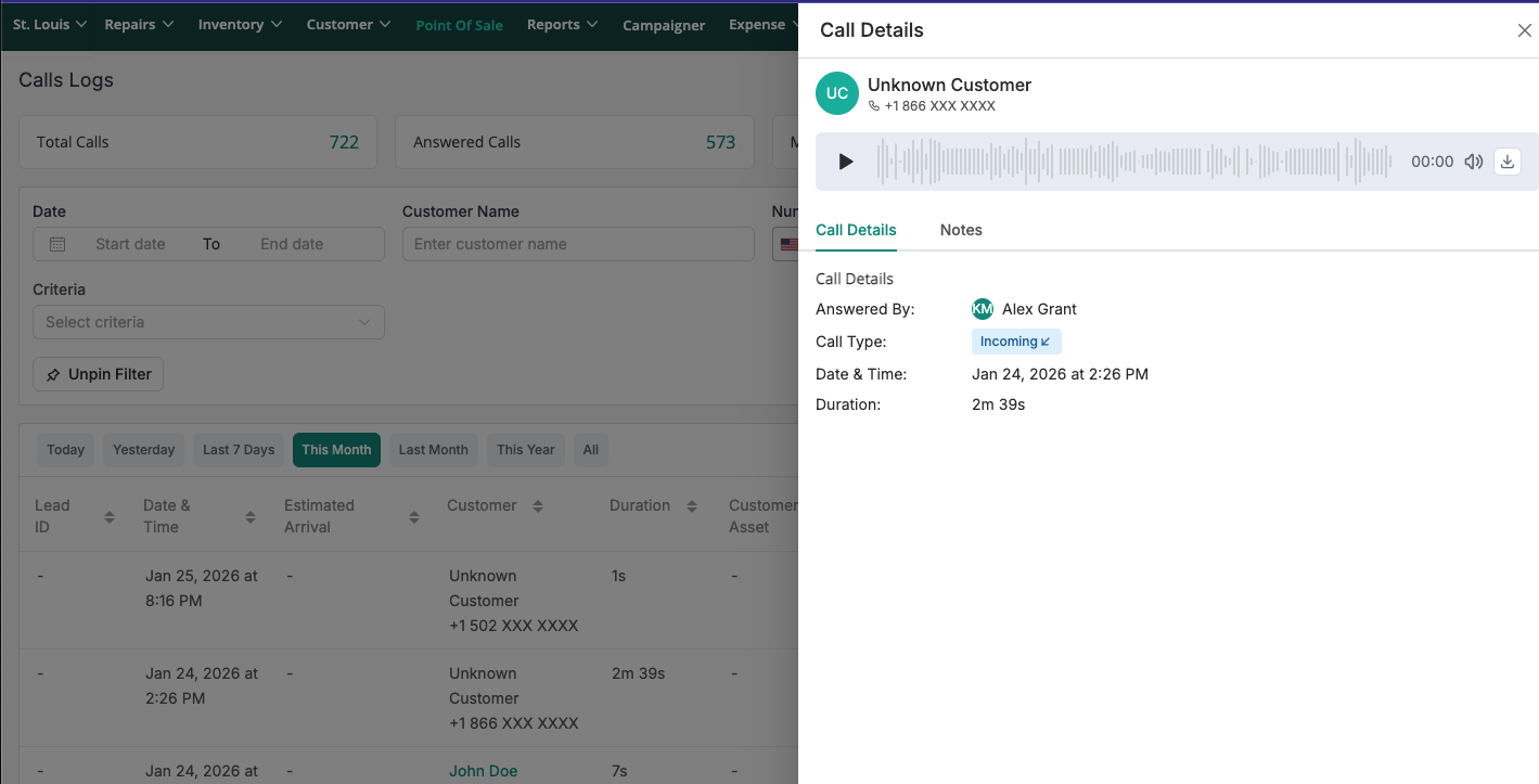 Click on any call row to open a right-side drawer which will contain important details such as Customer name, phone number along with other important information.