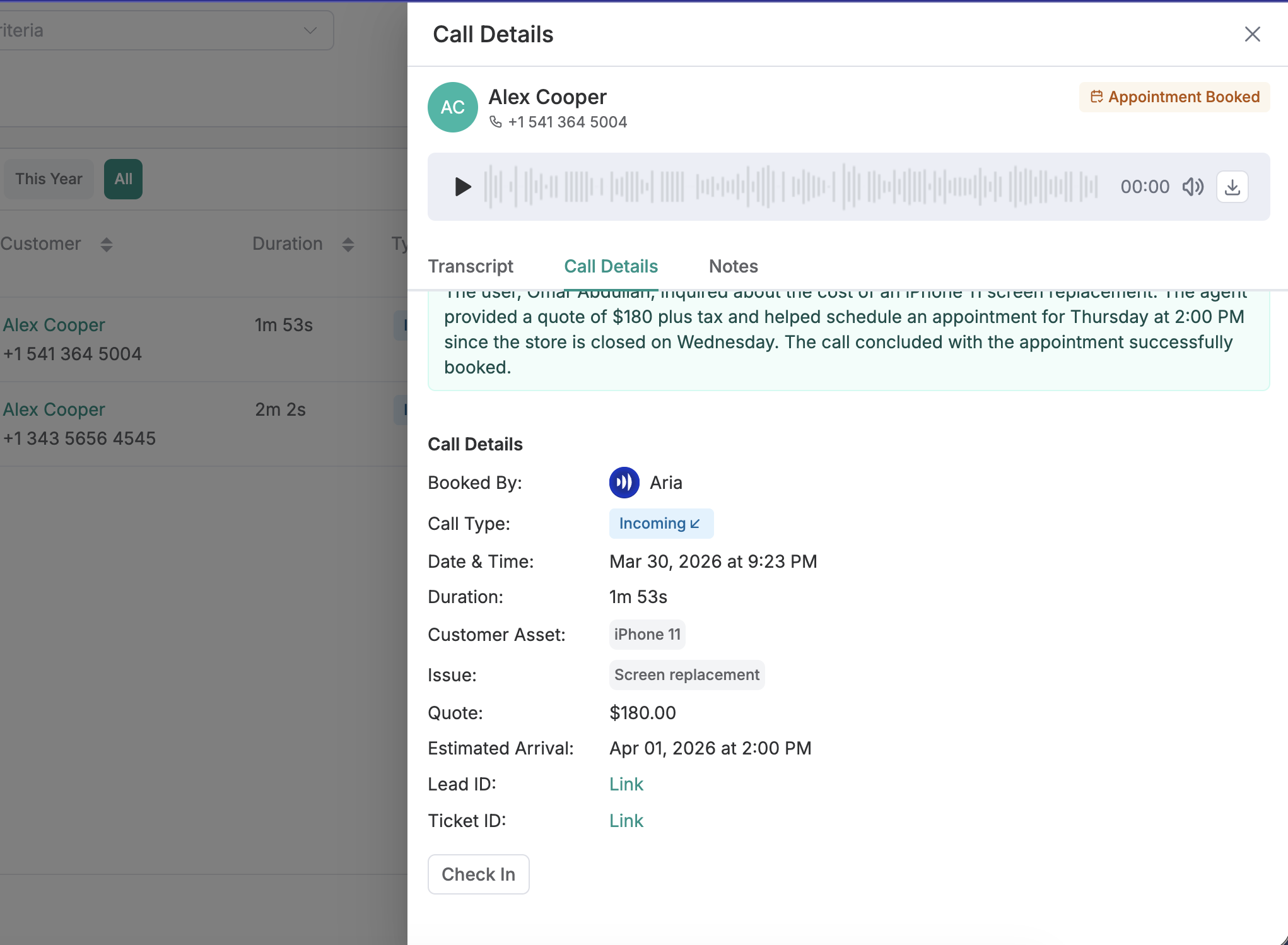 Click on any call row to open a right-side drawer which will contain important details such as Customer name, phone number along with other important information. You can quickly link lead or ticket to the call and check-in customer. You can learn more about quick check-in here.