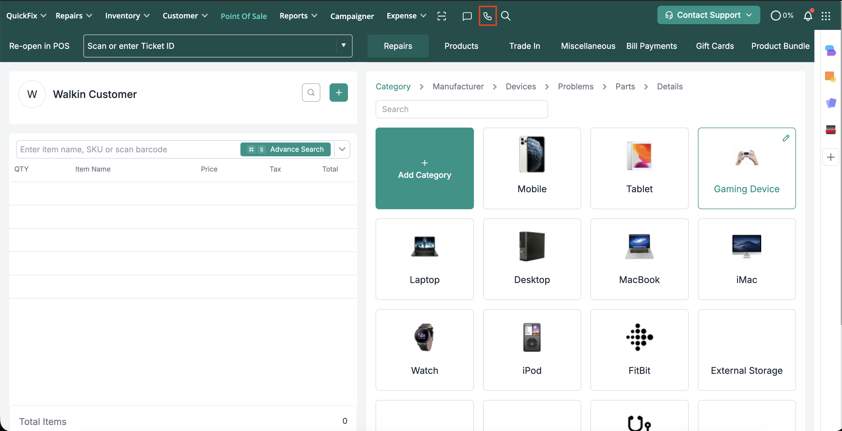 Go to the POS module and click the Phone icon located in the top navigation bar.