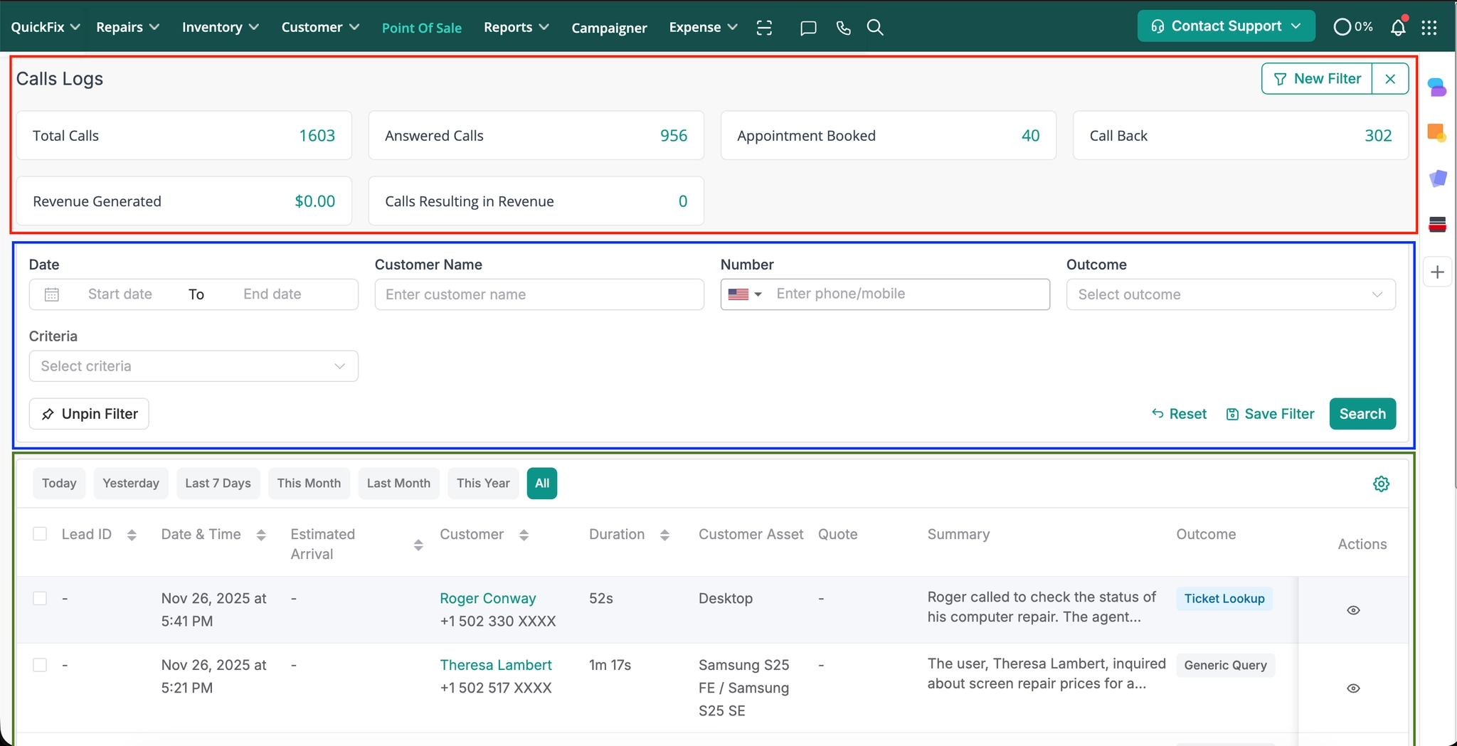 This guide outlines how to access and review Aria call logs, as well as calls that were manually answered by your team within RepairDesk, including call details, transcripts, and more.