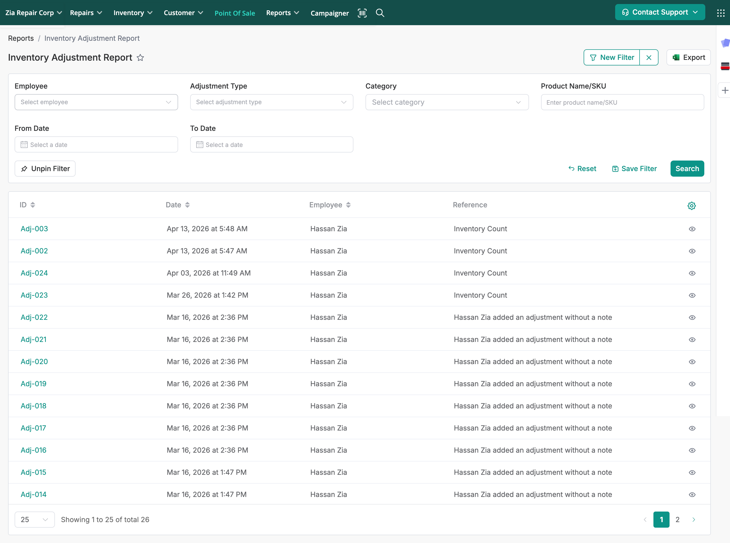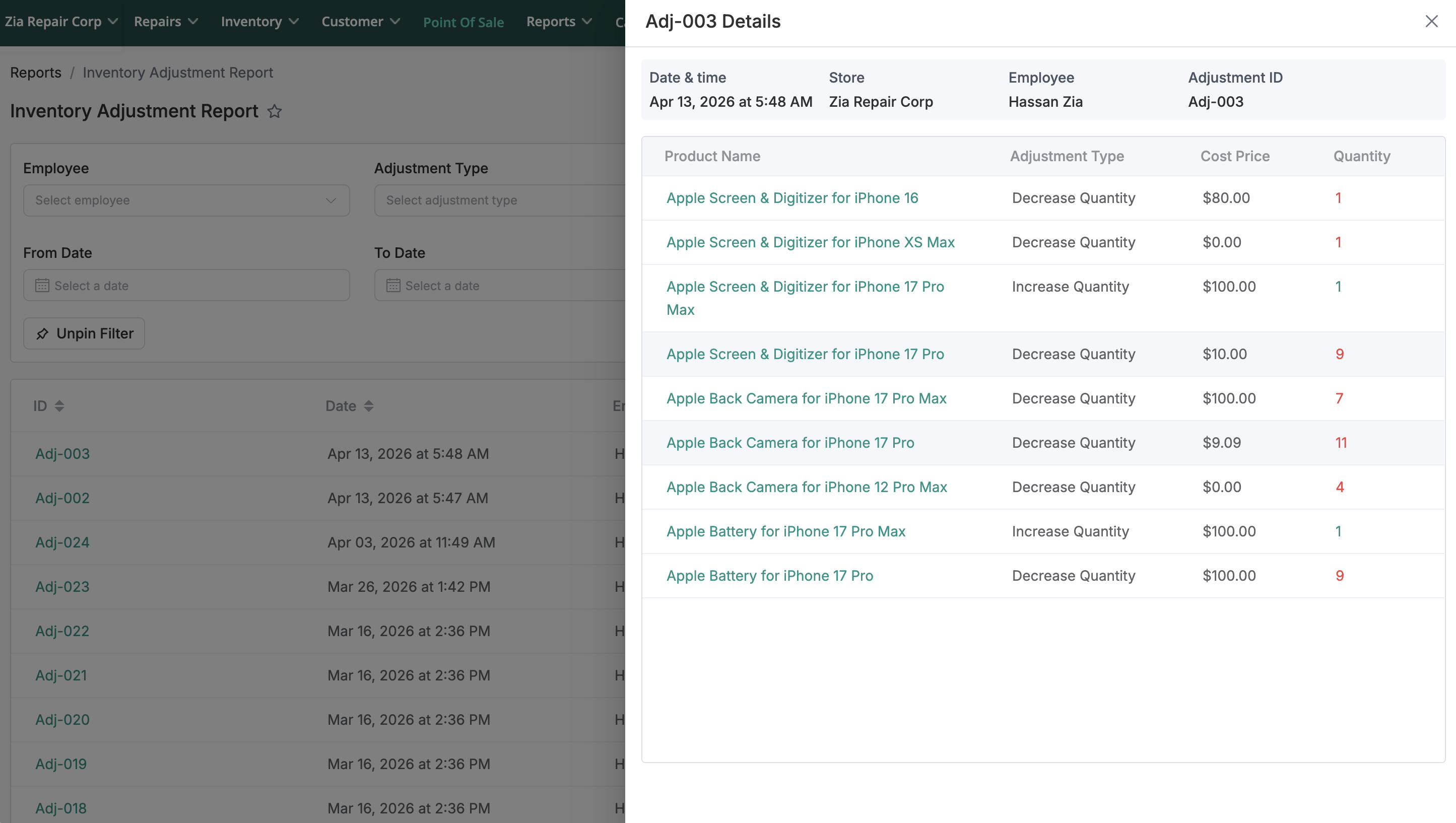 The Inventory Adjustment report in RepairDesk allows you to track and monitor changes in inventory levels, such as increased or decreased quantity. This article will guide you on how to use the report effectively and understand its various features.