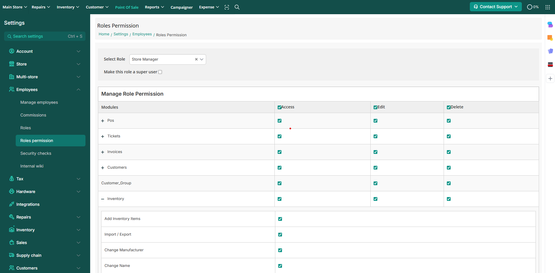 Store Settings > Employees > Roles Permissions > Inventory