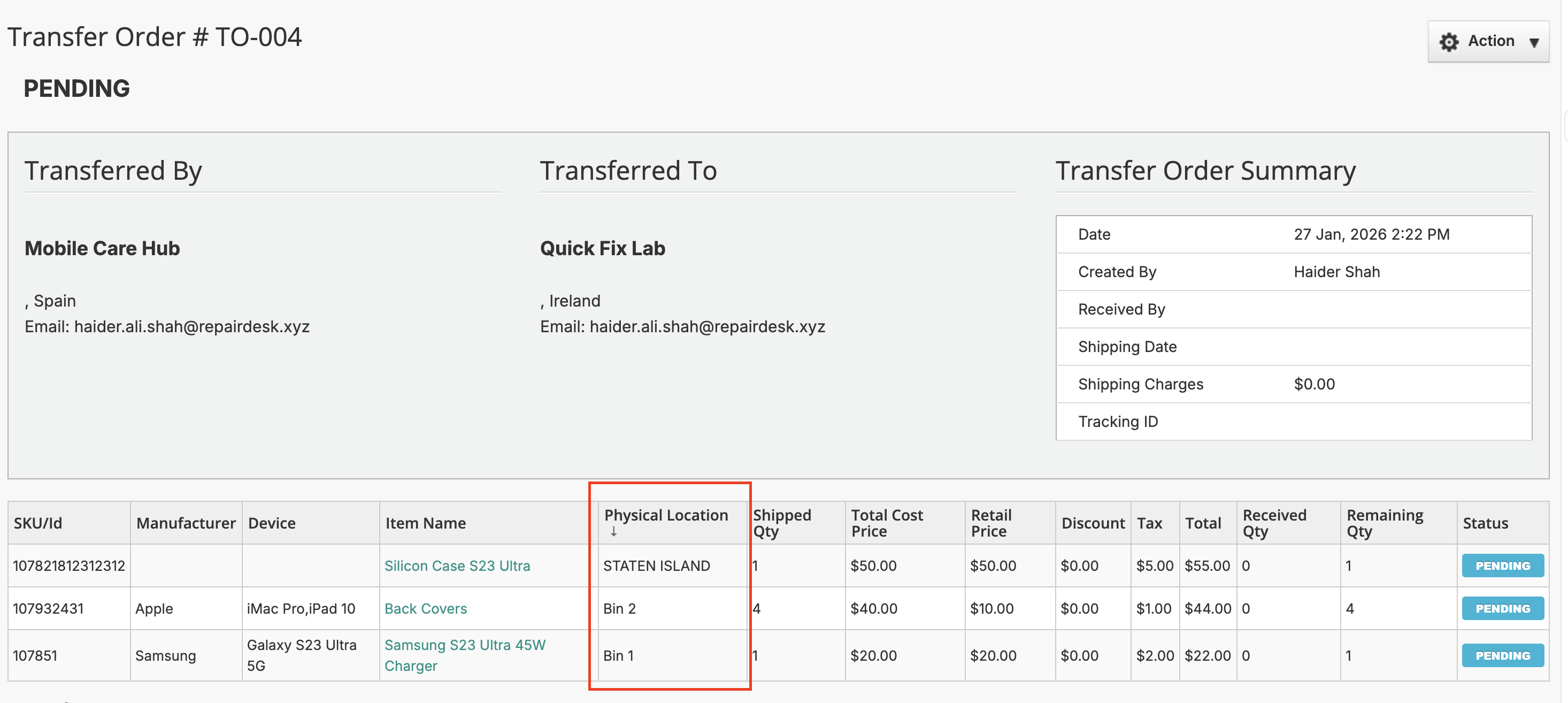 When creating or viewing a Transfer Order, you’ll see a Physical Location column next to the item name.