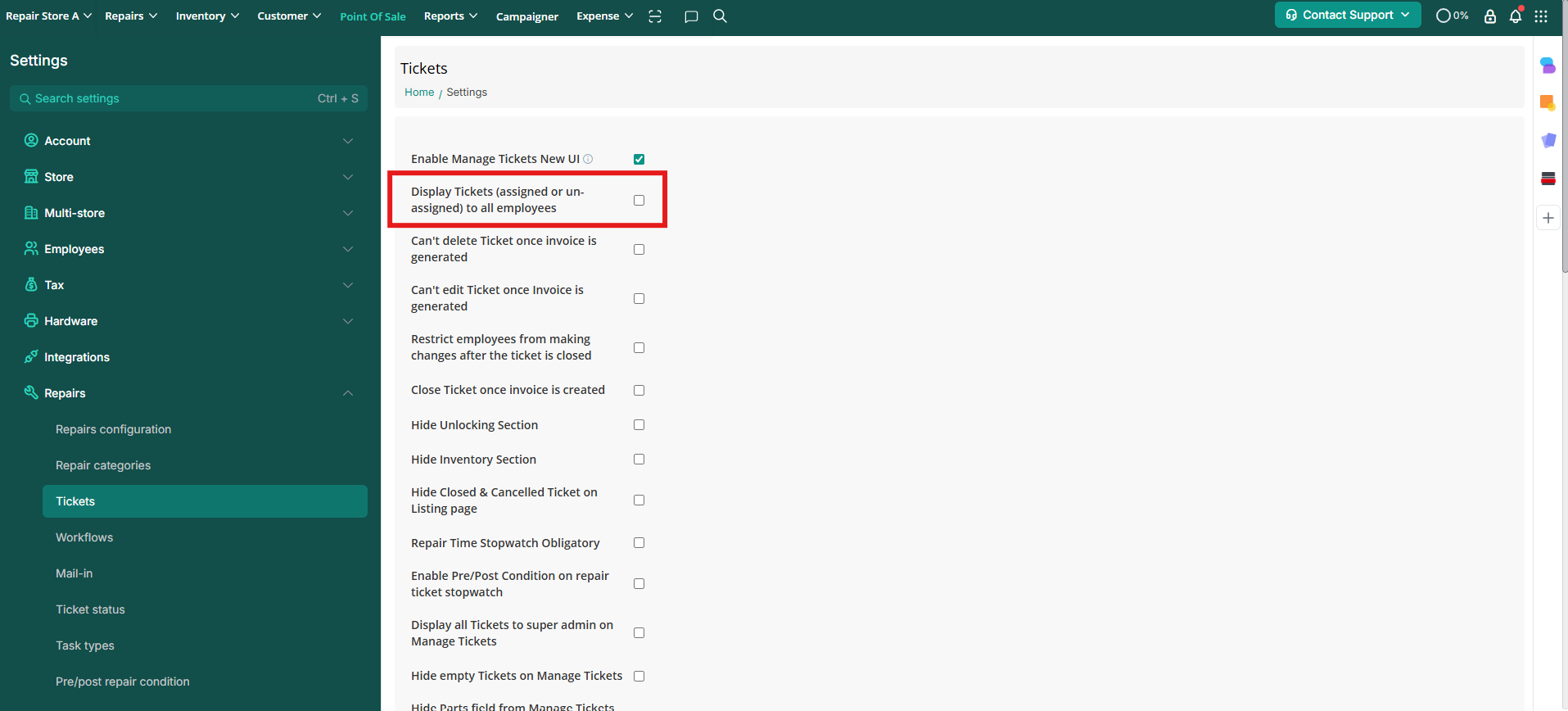 Check the box in front of Display Tickets (assigned or un-assigned) to all employees.