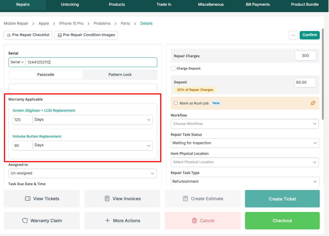Yes. When the “Itemize each service as a separate line item” option is enabled, you can view and manage warranty durations individually for each service during ticket creation. Each repair has its own warranty dropdown, allowing you to adjust terms per service.