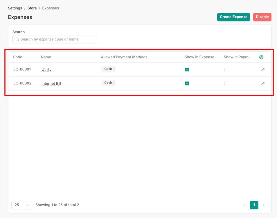 6. Once the Expense Code is saved, it will be available in the listing on the Expense listing page.