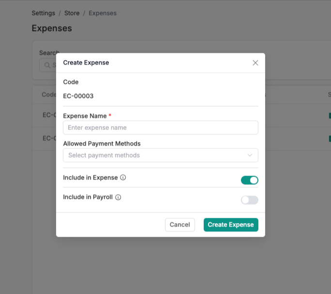 4. A pop-up will open where you can add the following details for the Expense Code:
