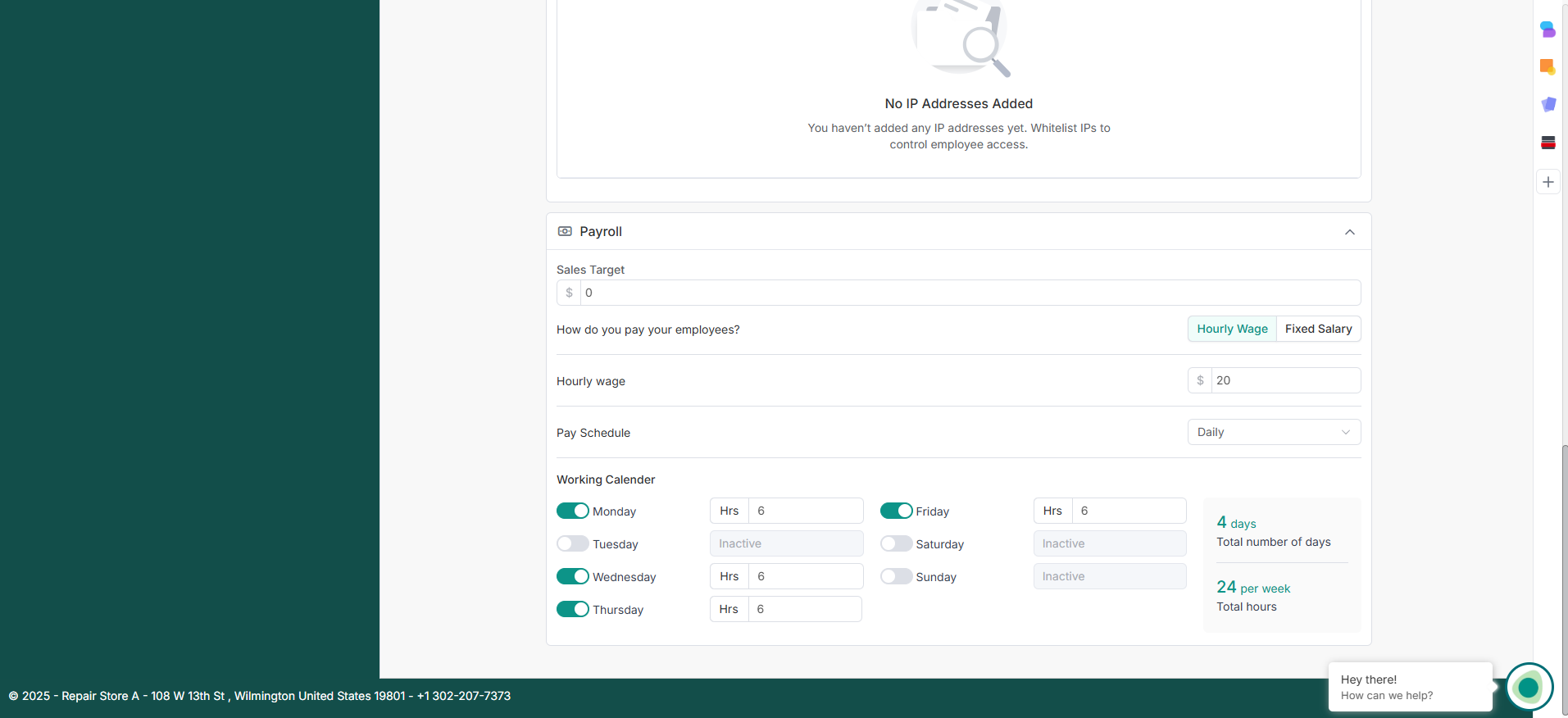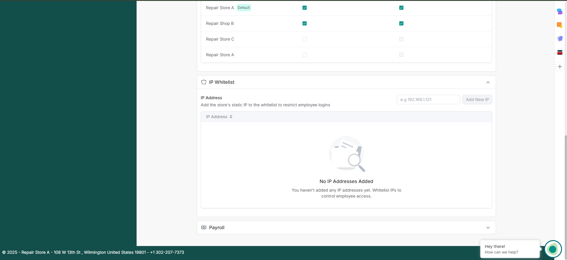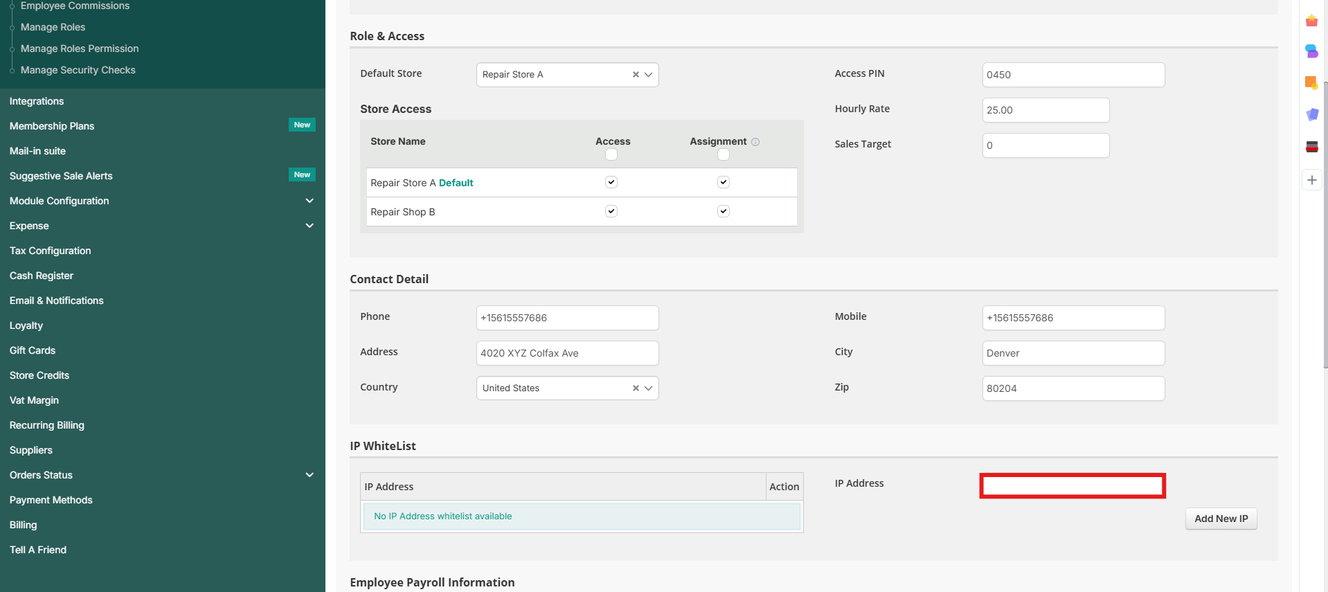 To ensure employees only log in from the store/approved locations, enter the store’s static IP address in the IP WhiteList section of the employee profile.