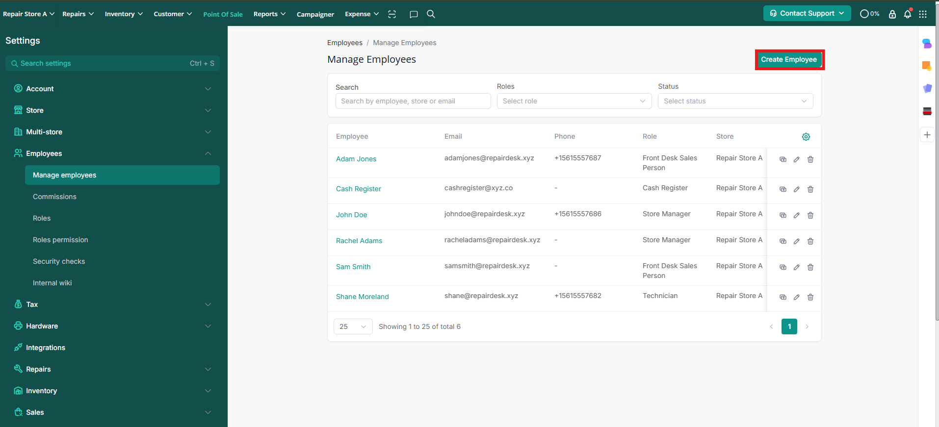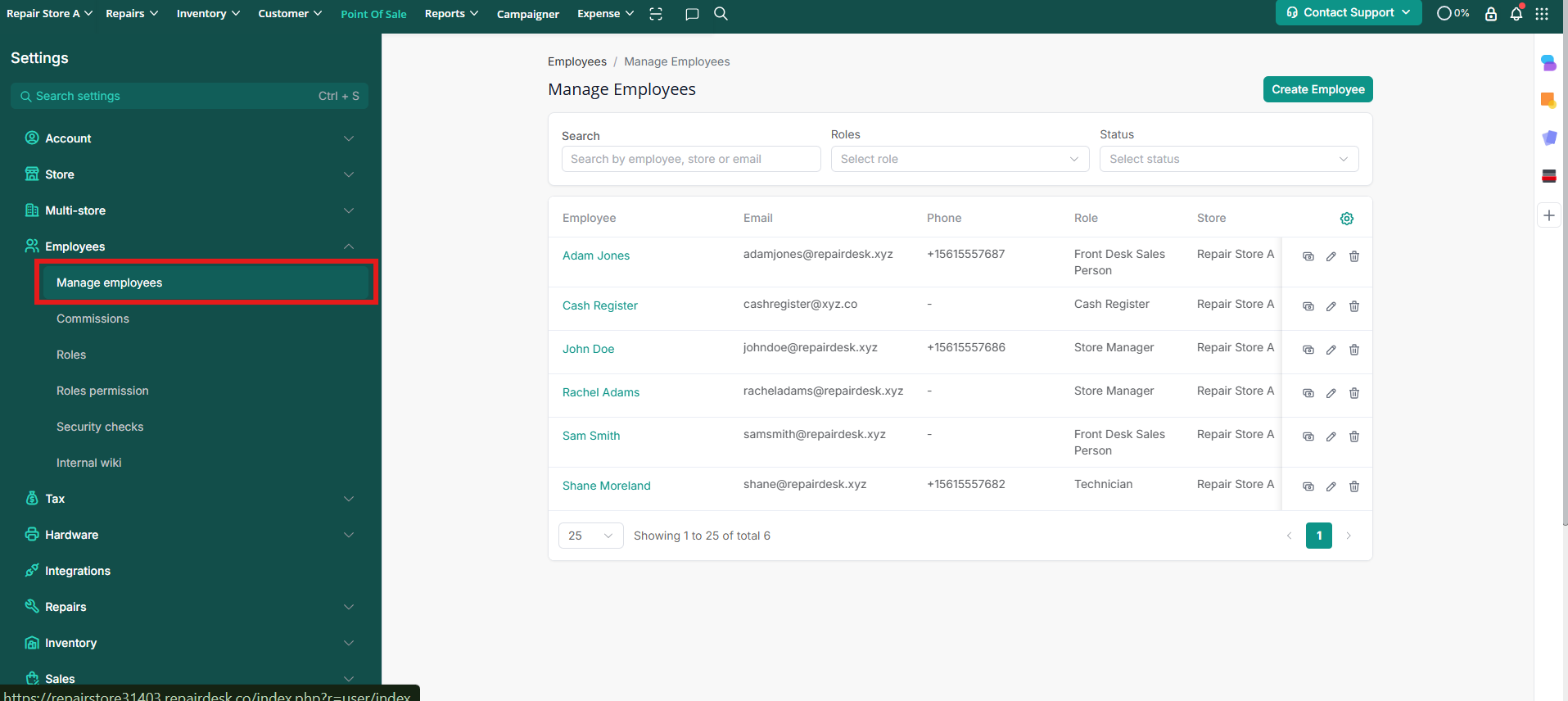 Assigning a role, such as Technician or Store Manager, determines what actions they can perform in RepairDesk. You can further customize role permissions from the Manage Roles section. (Learn more)