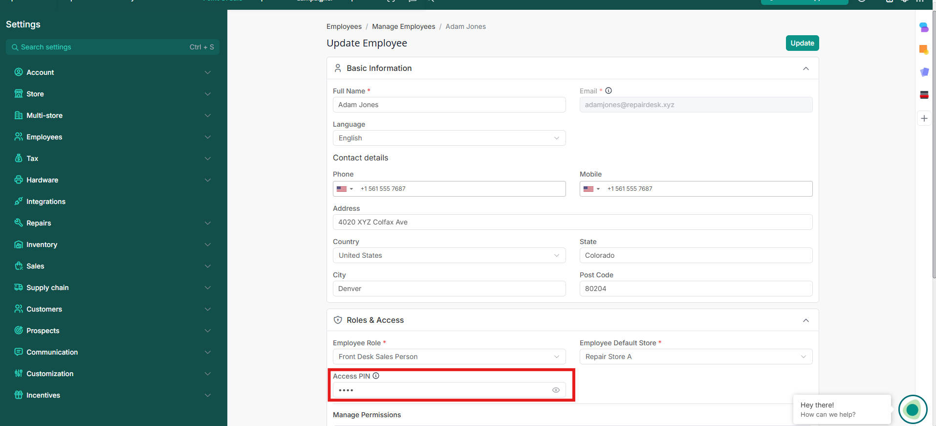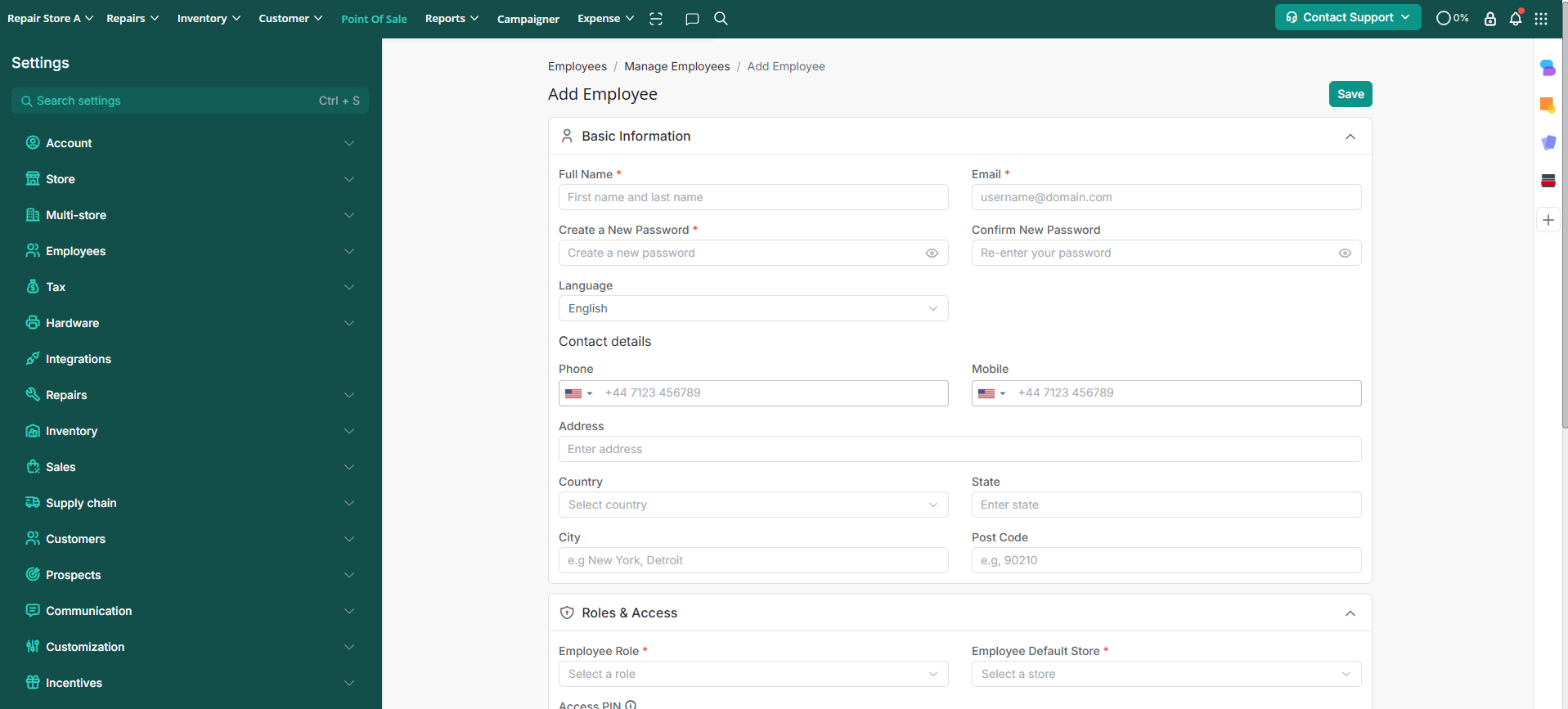 A 4-digit access PIN can be set while creating or editing an employee profile. This PIN is required for actions like clocking in/out, checking out, or booking a repair job.