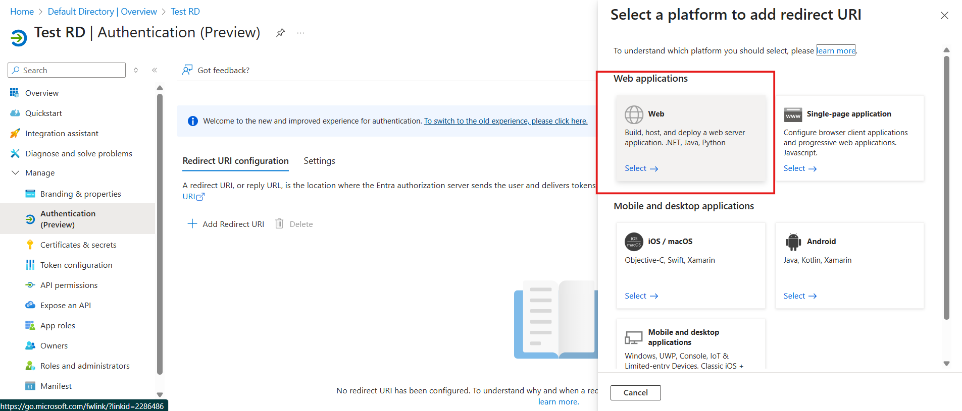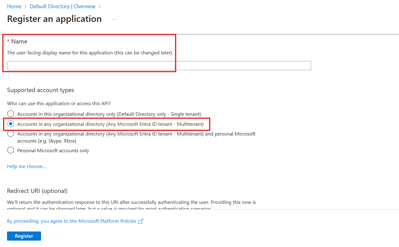 Select a Supported account, e-g Accounts in any organizational directory (Any Microsoft Entra ID tenant - Multitenant)