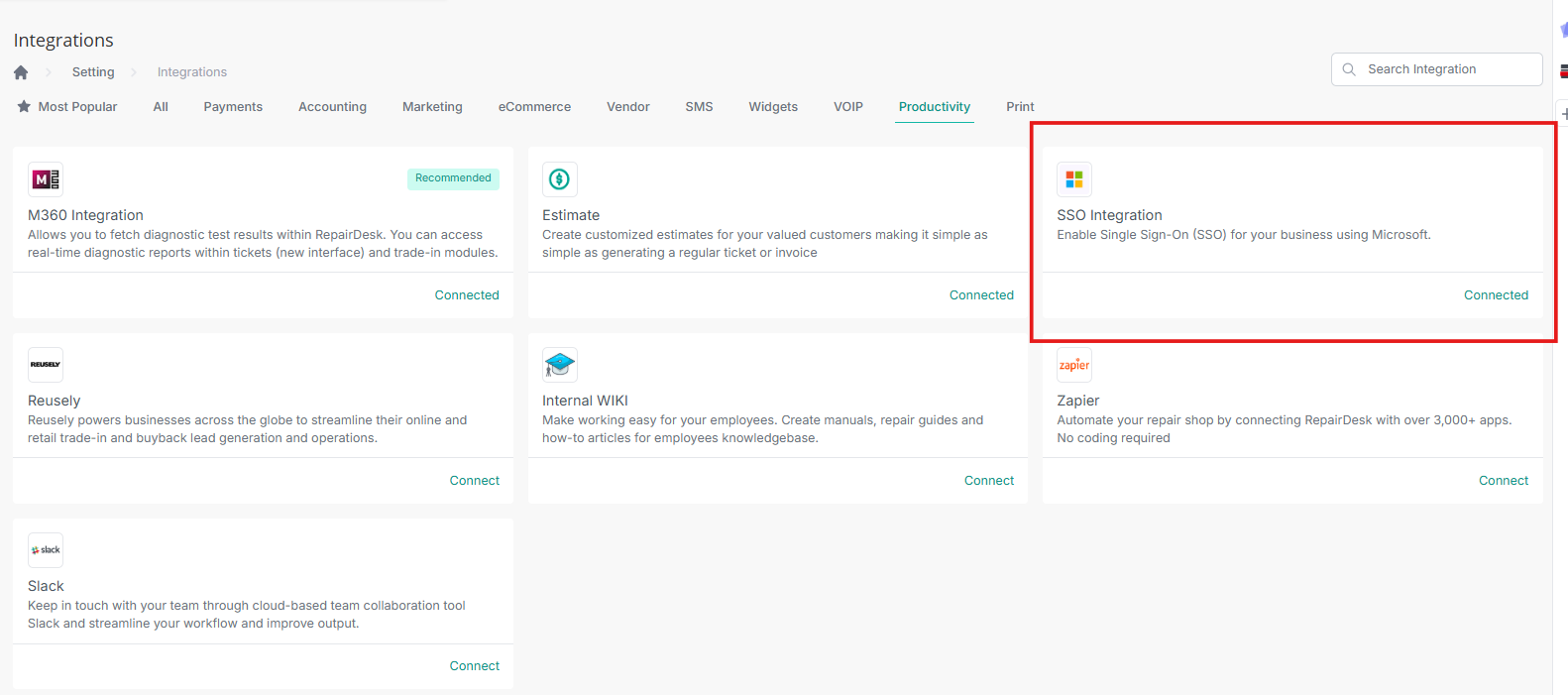 Go to Settings > Integrations > Productivity >Microsoft SSO