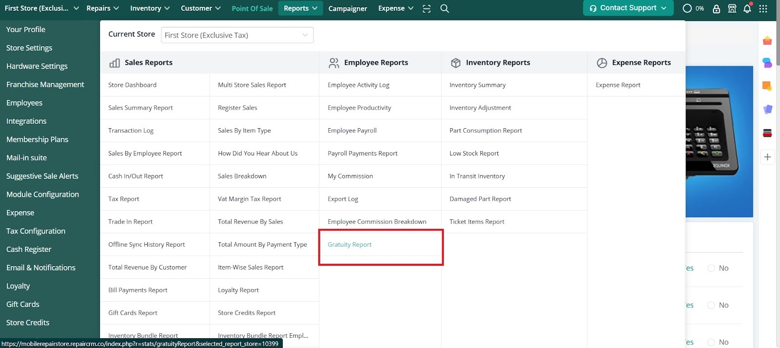 Employee tips are accessible in the Reports dropdown under Employee Reports > Gratuity Report.