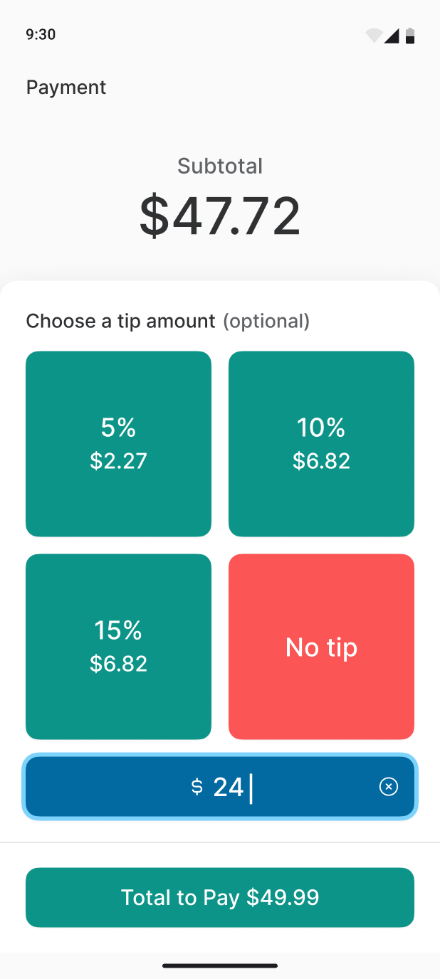 The total amount will automatically update on the terminal screen based on the selected Tip Amount.