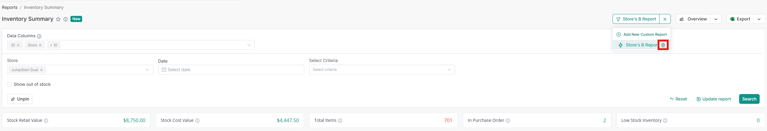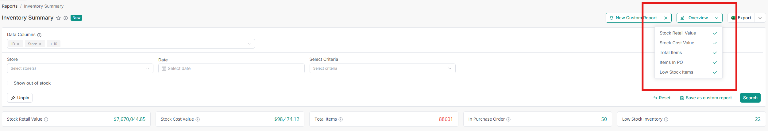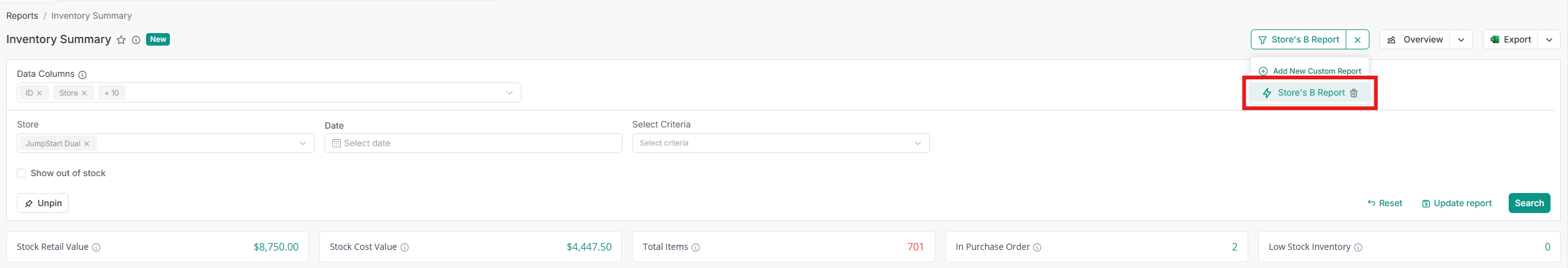 - Open the Custom Reports dropdown in the Inventory Summary Report.