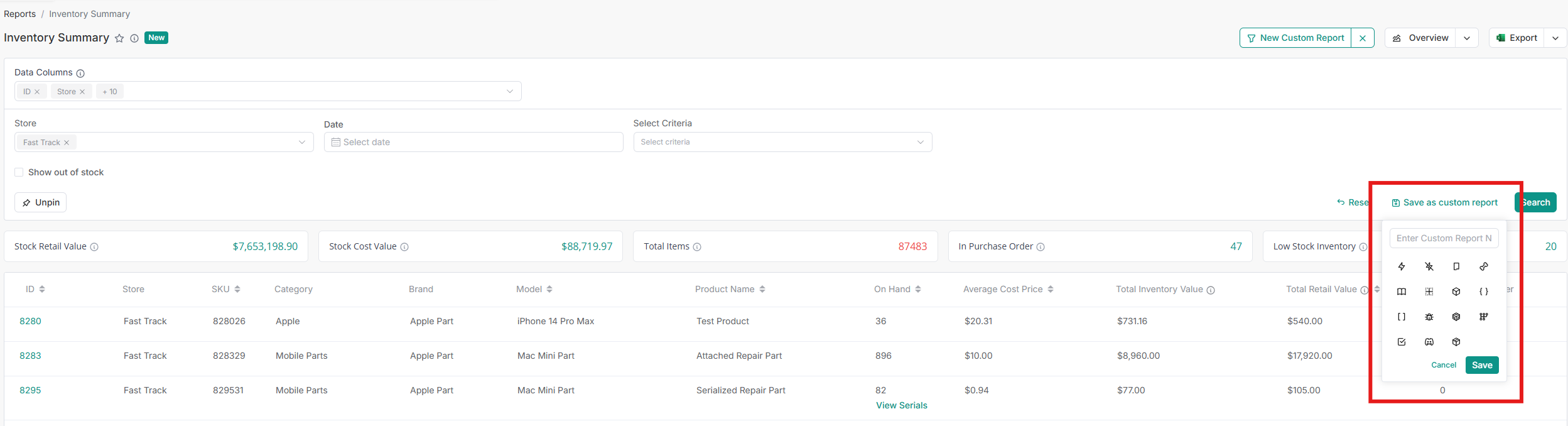 With RepairDesk’s Custom Reports feature in the Inventory Summary Report, you can now build and save your own report views. Select the columns you care about, apply filters, and customize your overview tiles, all in one place.