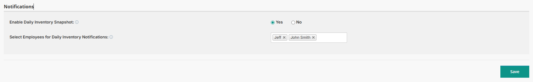 To send daily inventory snapshot notifications to specific employees, select the employees from the dropdown field.