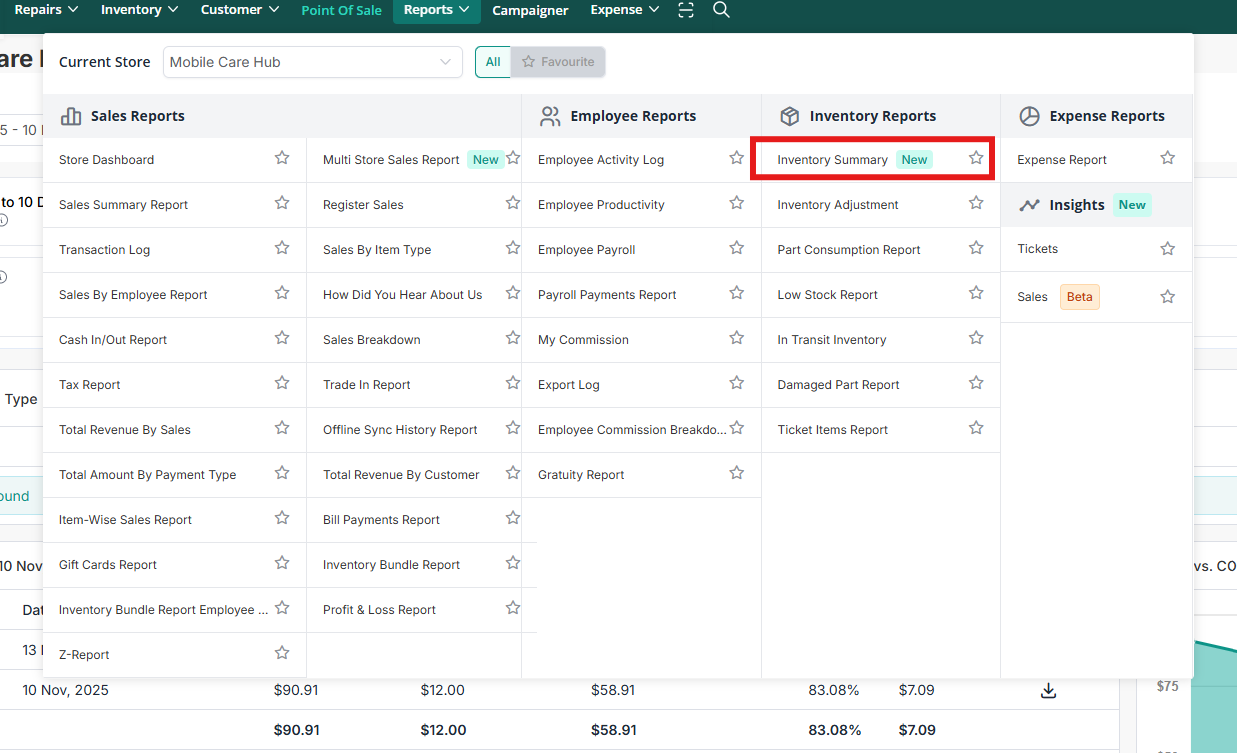 - Go to Reports > Inventory Summary Report.