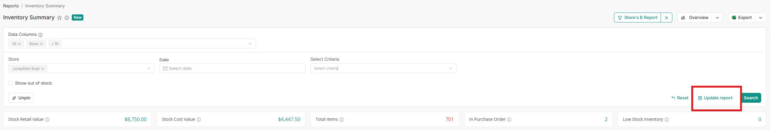 Keeping track of inventory performance often requires viewing only specific data points like cost, retail value, or on-hand quantity. Previously, the Inventory Summary Report displayed a fixed set of columns for all users, which made it difficult to focus on the most relevant information.