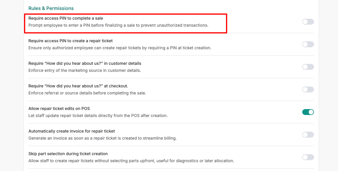 A. Sure you can! Just head to Settings >> Module Configuration >> POS and enable the trigger for "Require access PIN to complete a sale" and hit Save button. Now whenever an employee is about to make a transaction, RepairDesk will ask the employee to enter his/ her access pin.