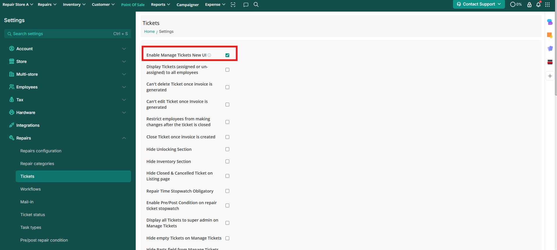 Go to Settings > Repairs > Tickets, and enable the "New Manage Tickets UI" toggle.