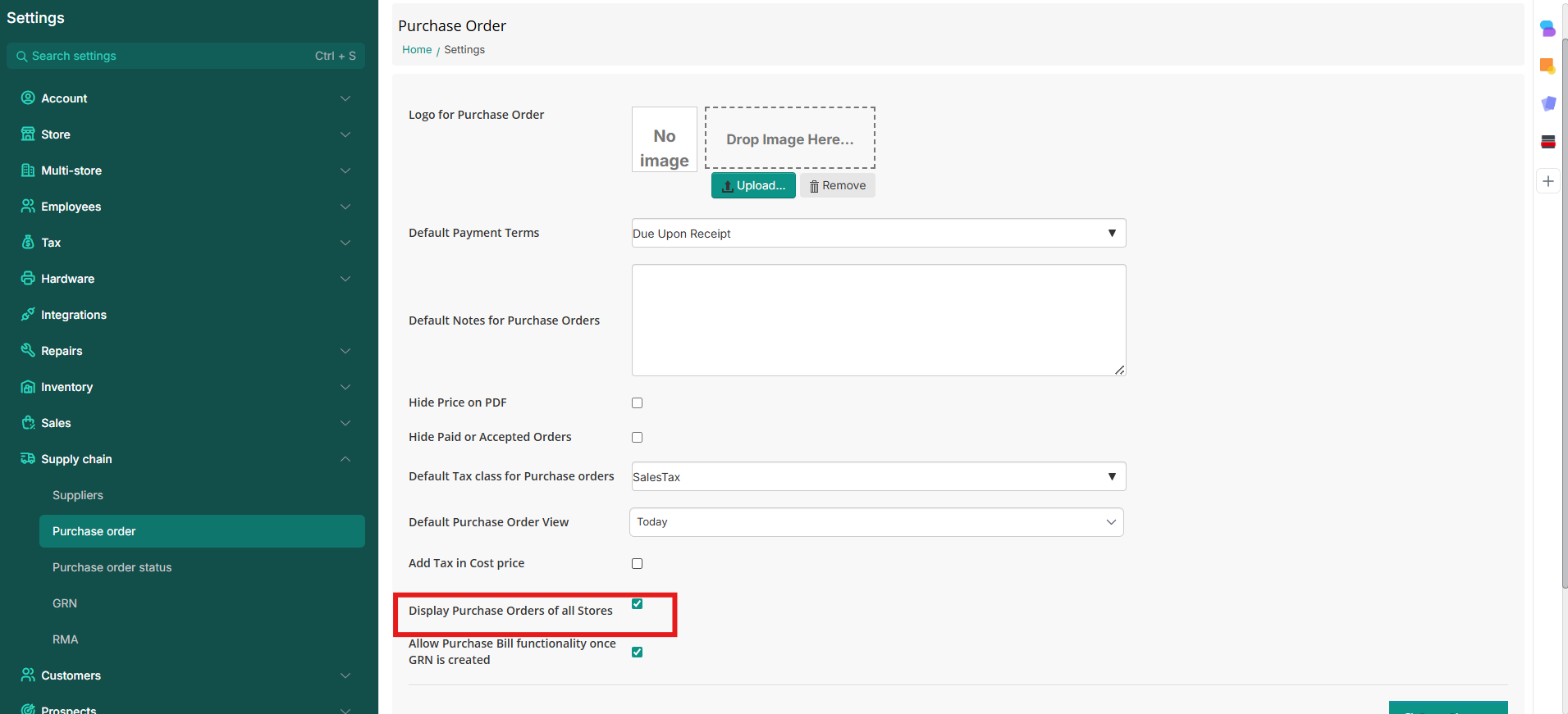 If you want to view the purchase order of different stores from the main store, you can do that by simply going to the Store Settings > Supply Chain > Purchase Order and then enable the following trigger.